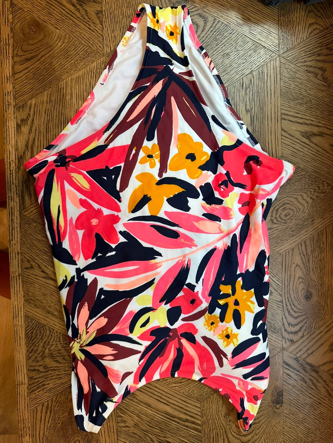 A one-piece swimsuit with a floral pattern and a tie-up back. The back of the suit has a cut-out design with tie-up straps. This swimsuit is a great choice for any summer outing.