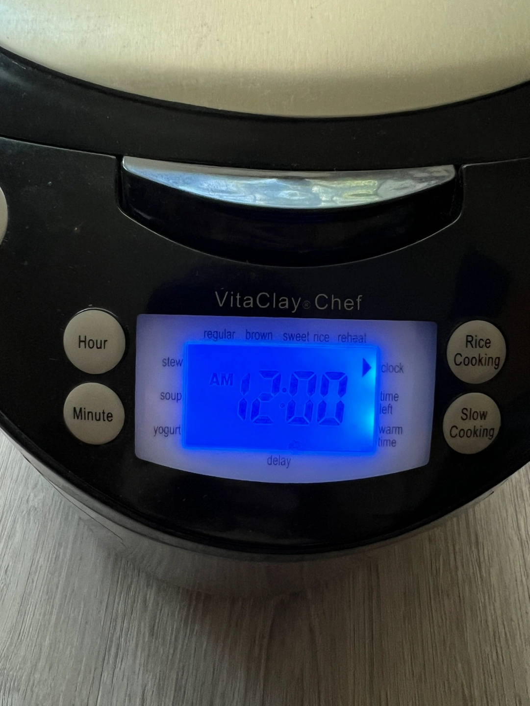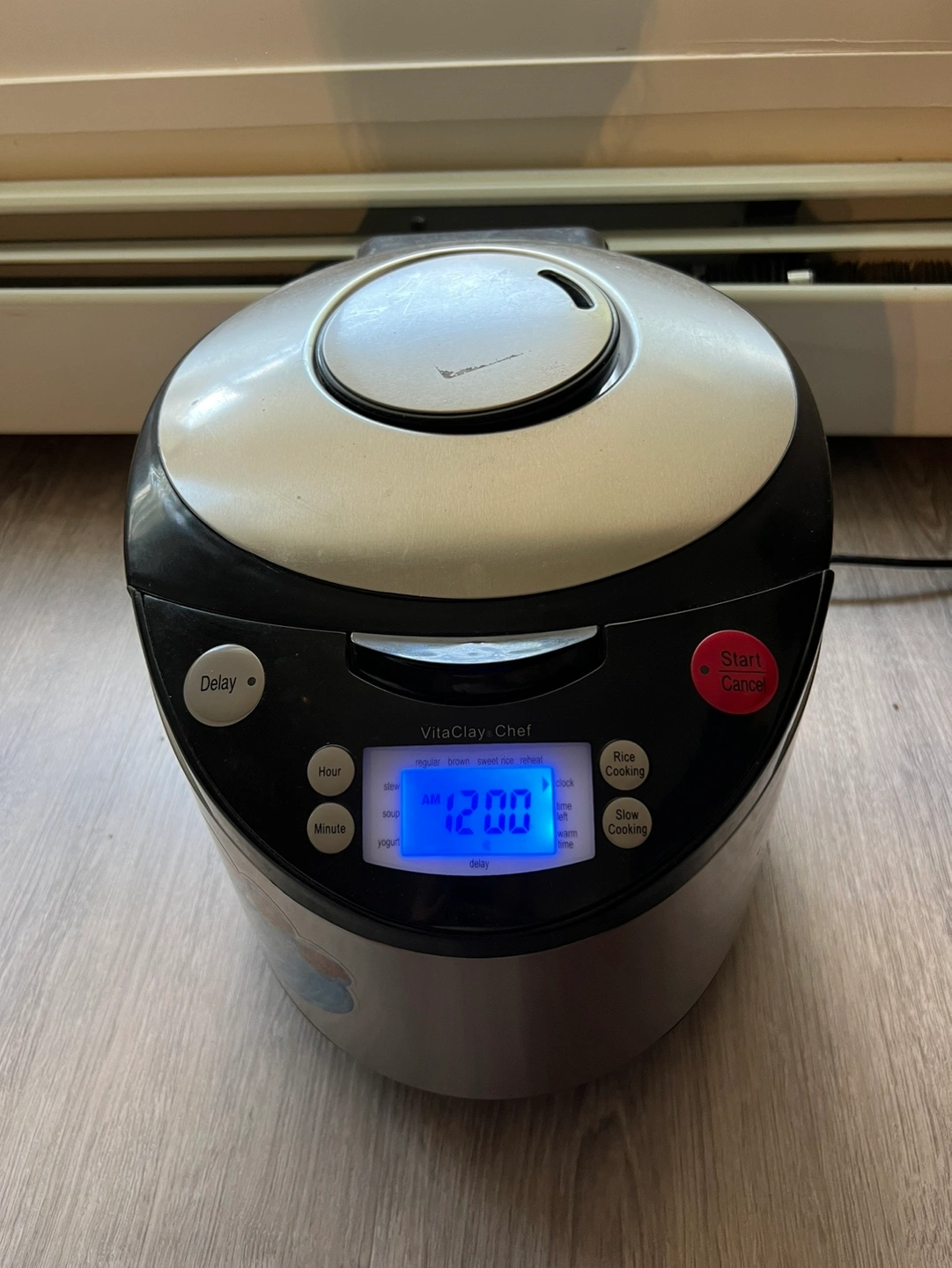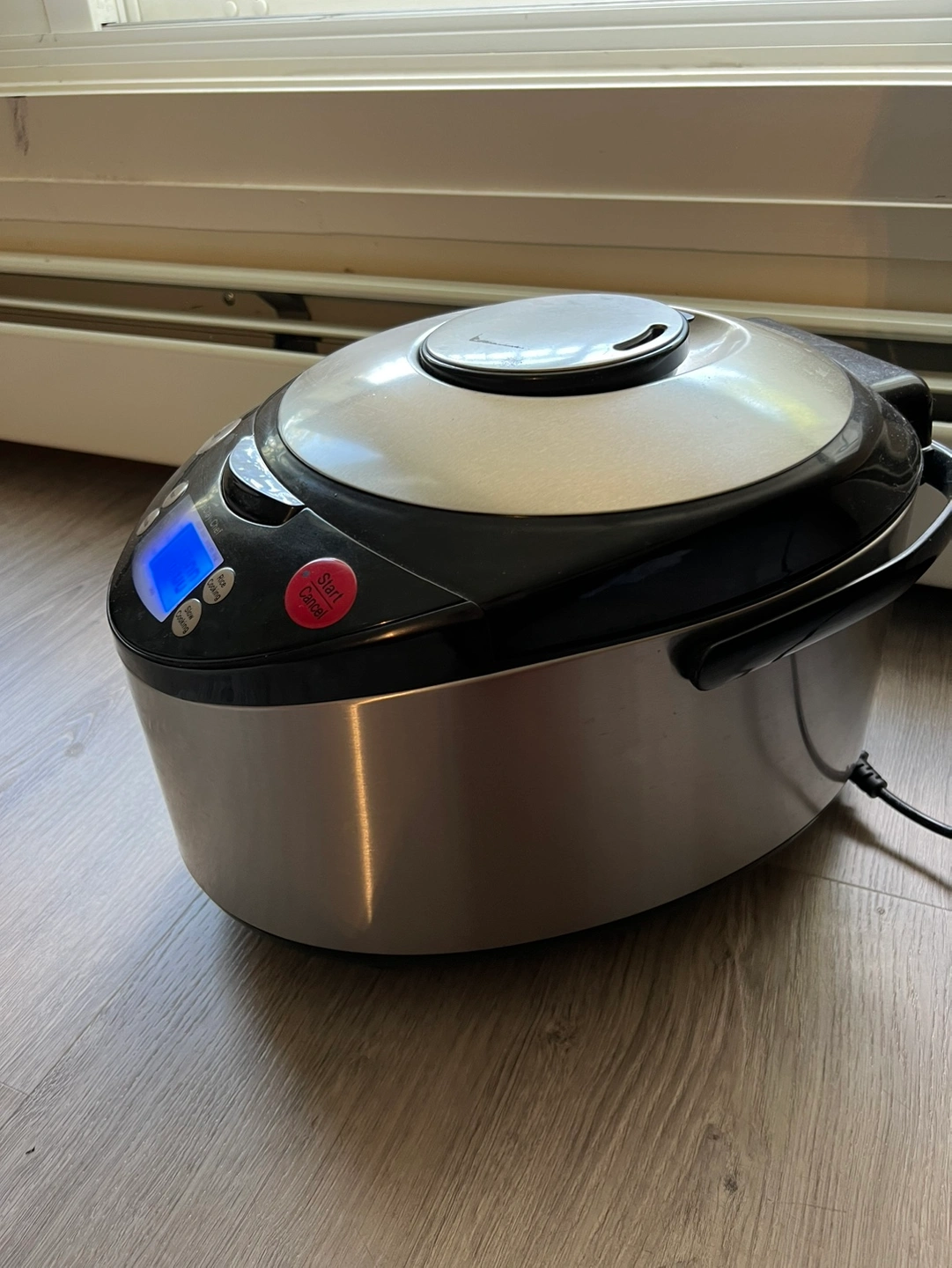 This is a multi-functional appliance that can cook rice, soup, stew, and yogurt. It has a digital display that shows the time and the different cooking settings. It also has a delay timer and a keep warm function.