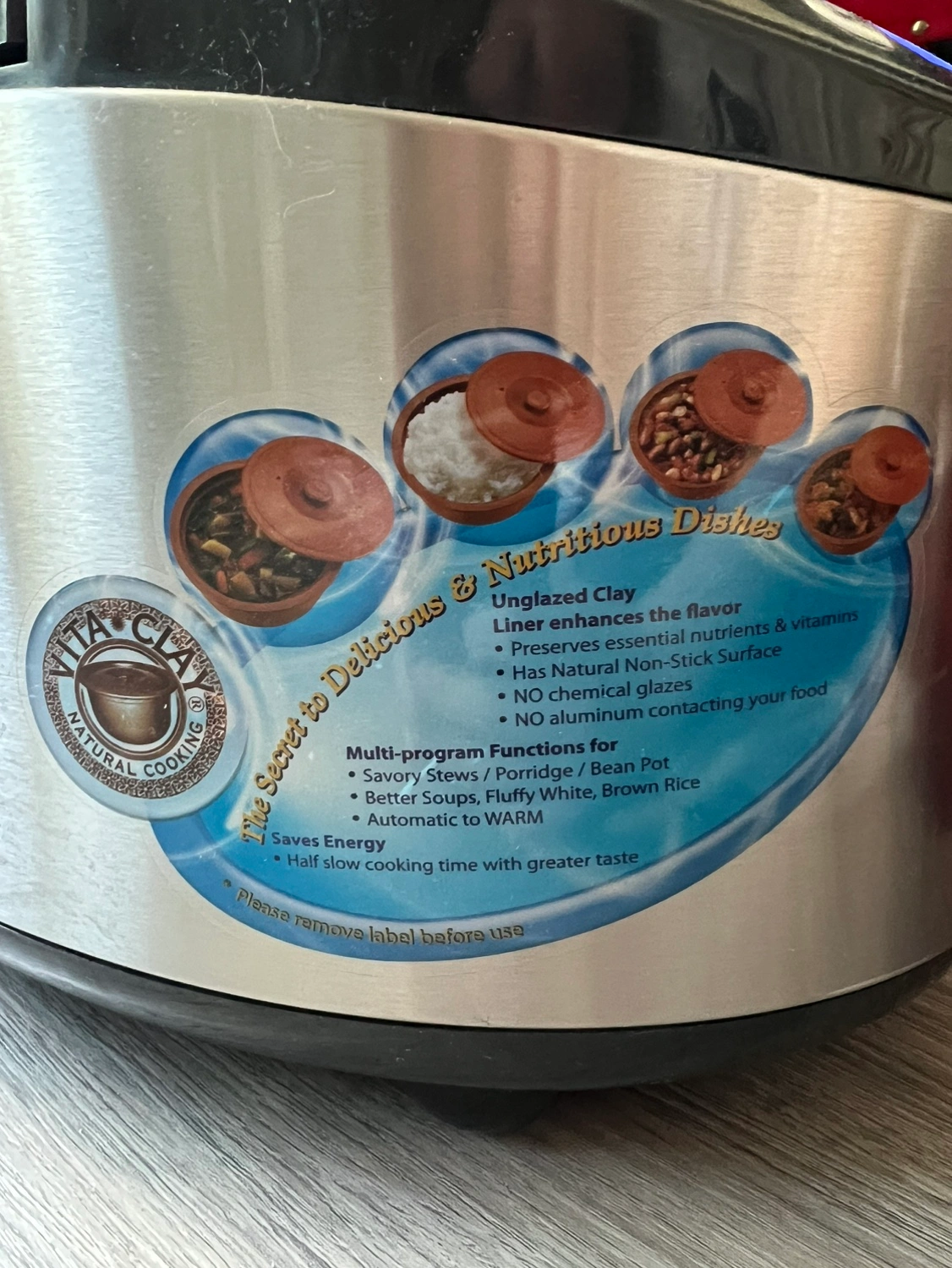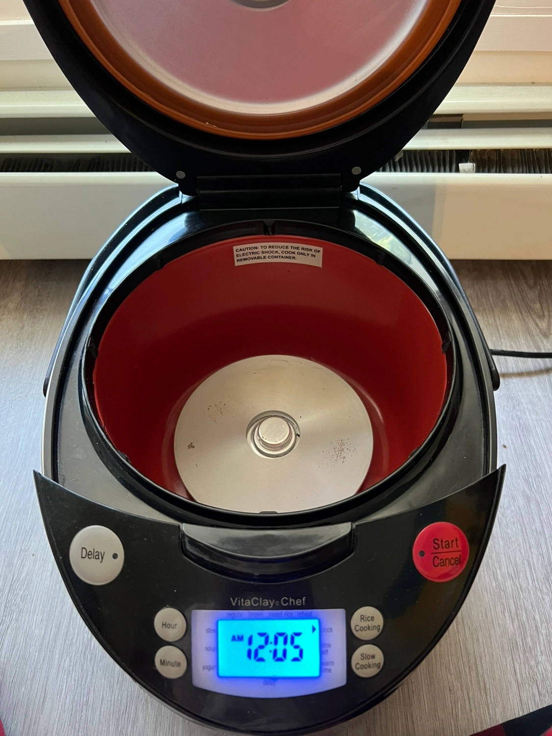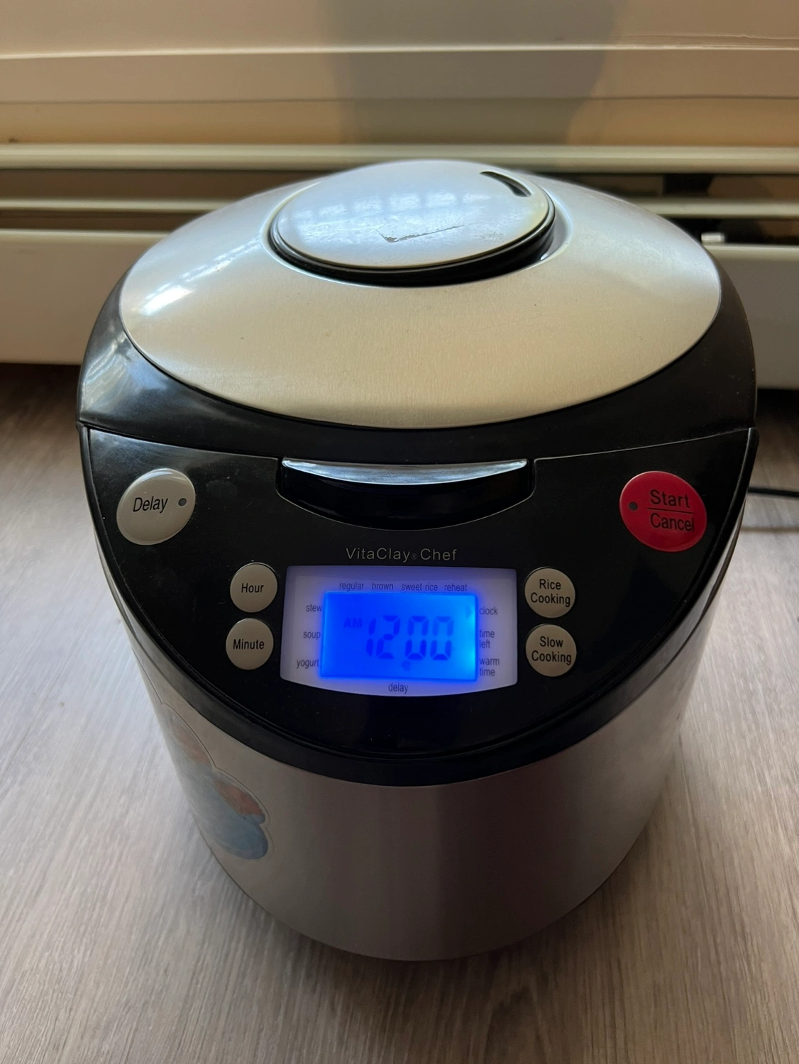 This is a multi-functional appliance that can cook rice, soup, stew, and yogurt. It has a digital display that shows the time and the different cooking settings. It also has a delay timer and a keep warm function.