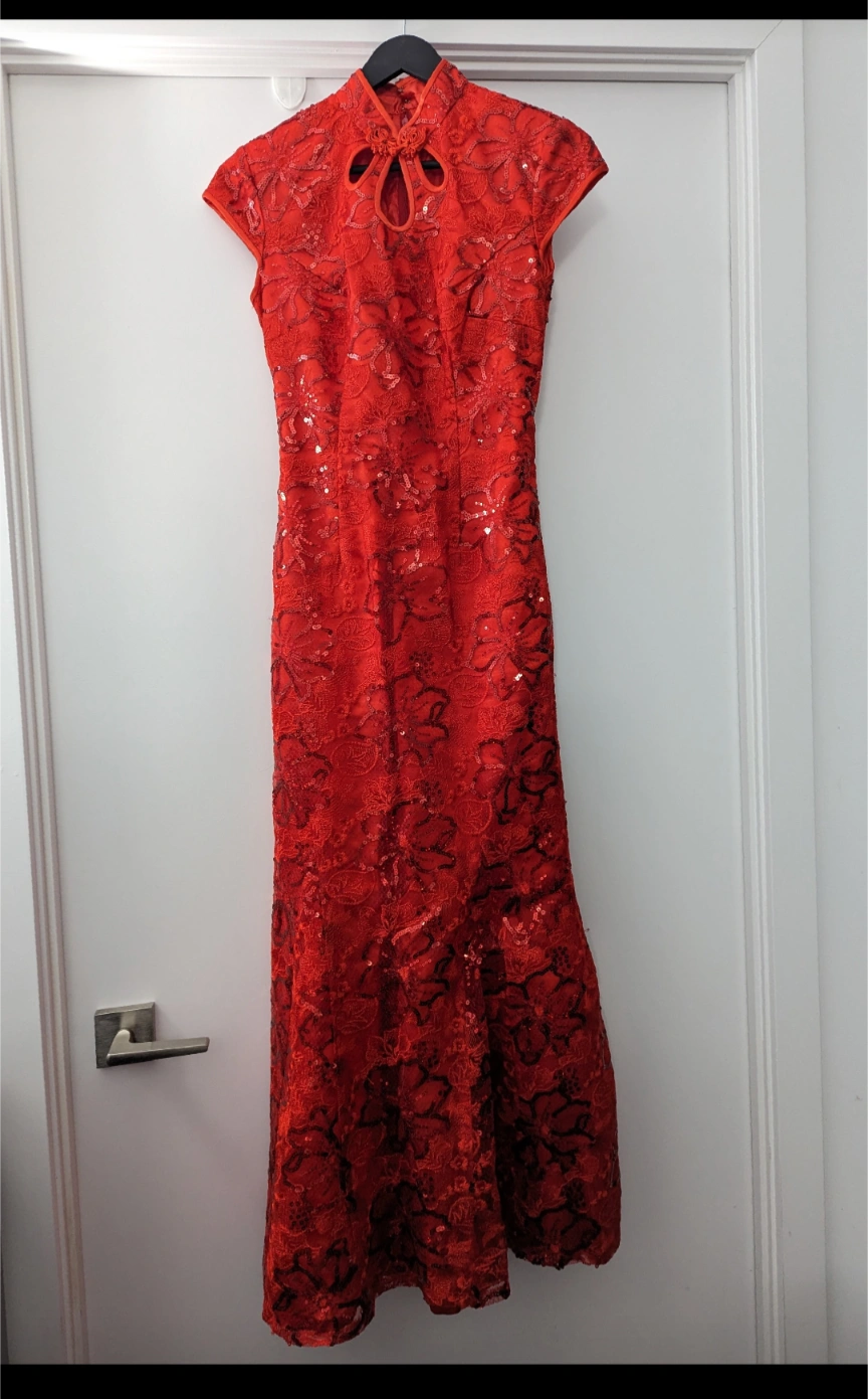 Beautiful red sequined cheongsam dress with intricate floral embroidery and a keyhole neckline. It has a flattering fitted silhouette and a flowing skirt. Perfect for a special occasion or your wedding.