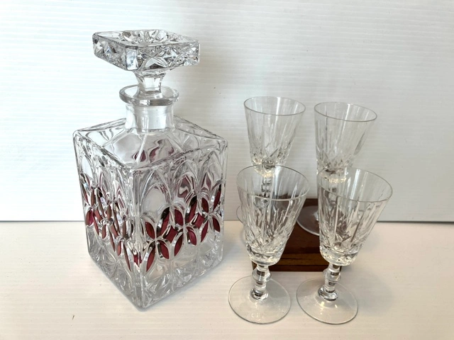 22beautiful crystal decanter and four matching crystal glasses. Echt Bleikristall, Made In Western Germany, Over 24% Lead Crystal, Highly Polished Vintage Crystal Decanter, Red Accents, Whiskey Decanter