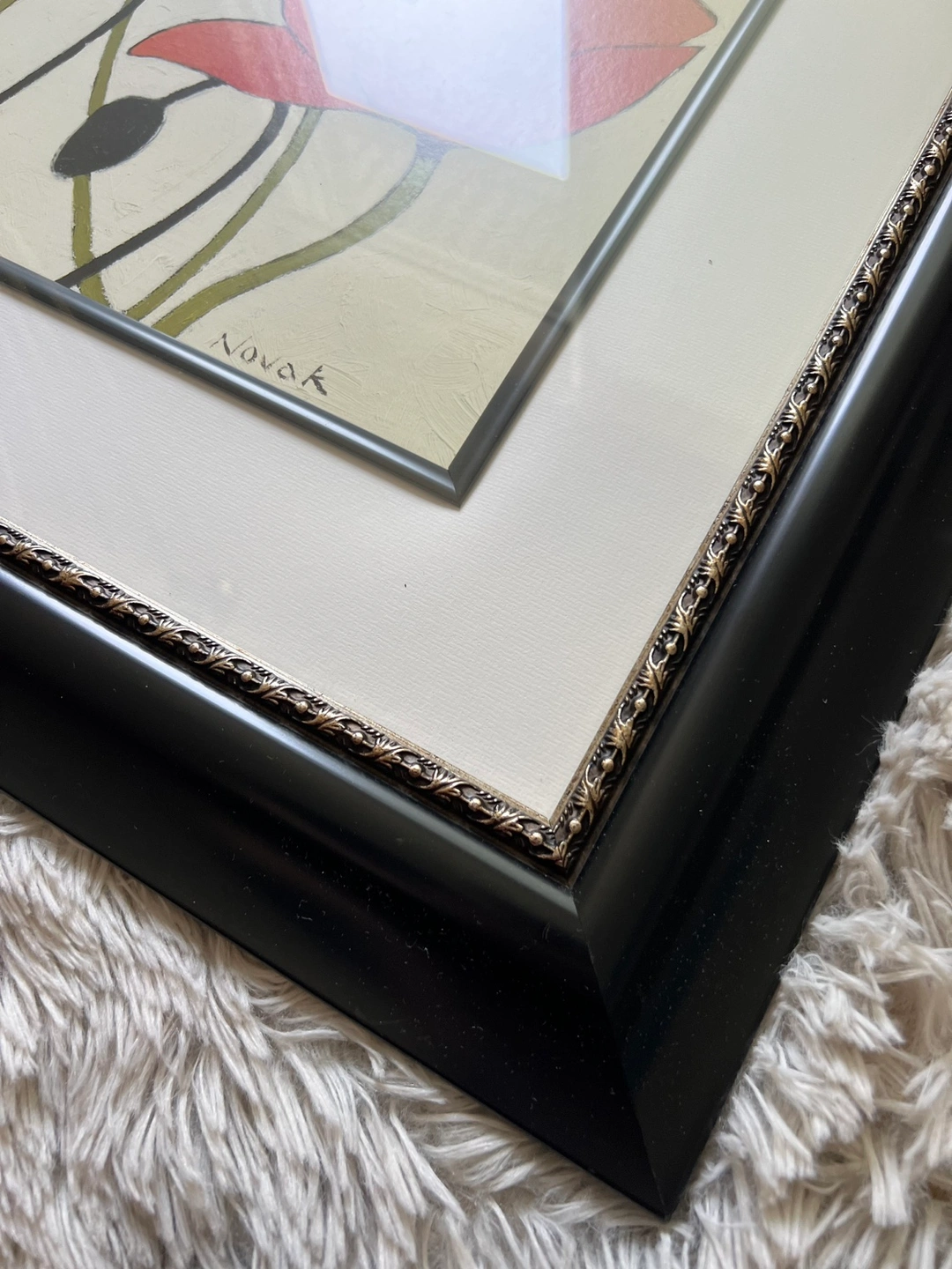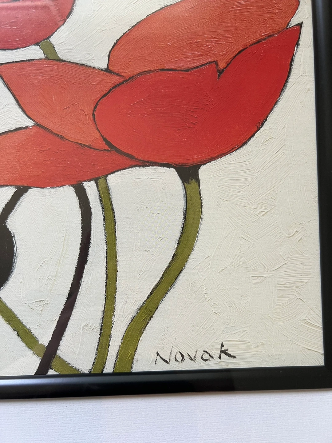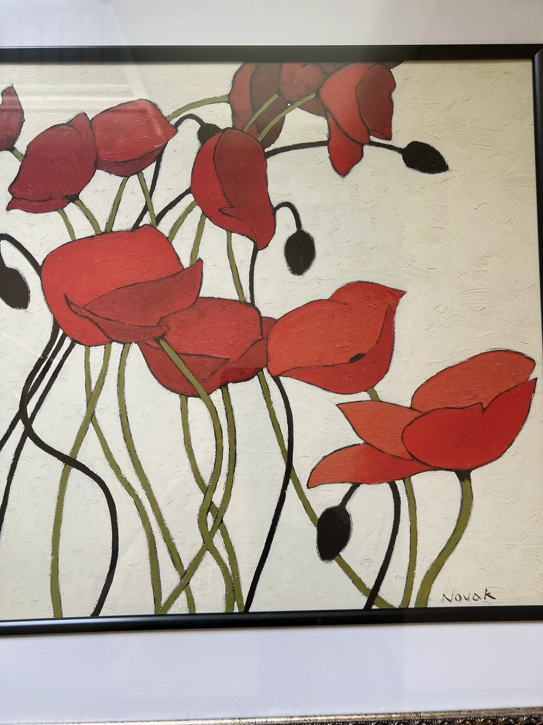 Framed oil painting featuring red poppies and signed "Novak" in the bottom right corner.