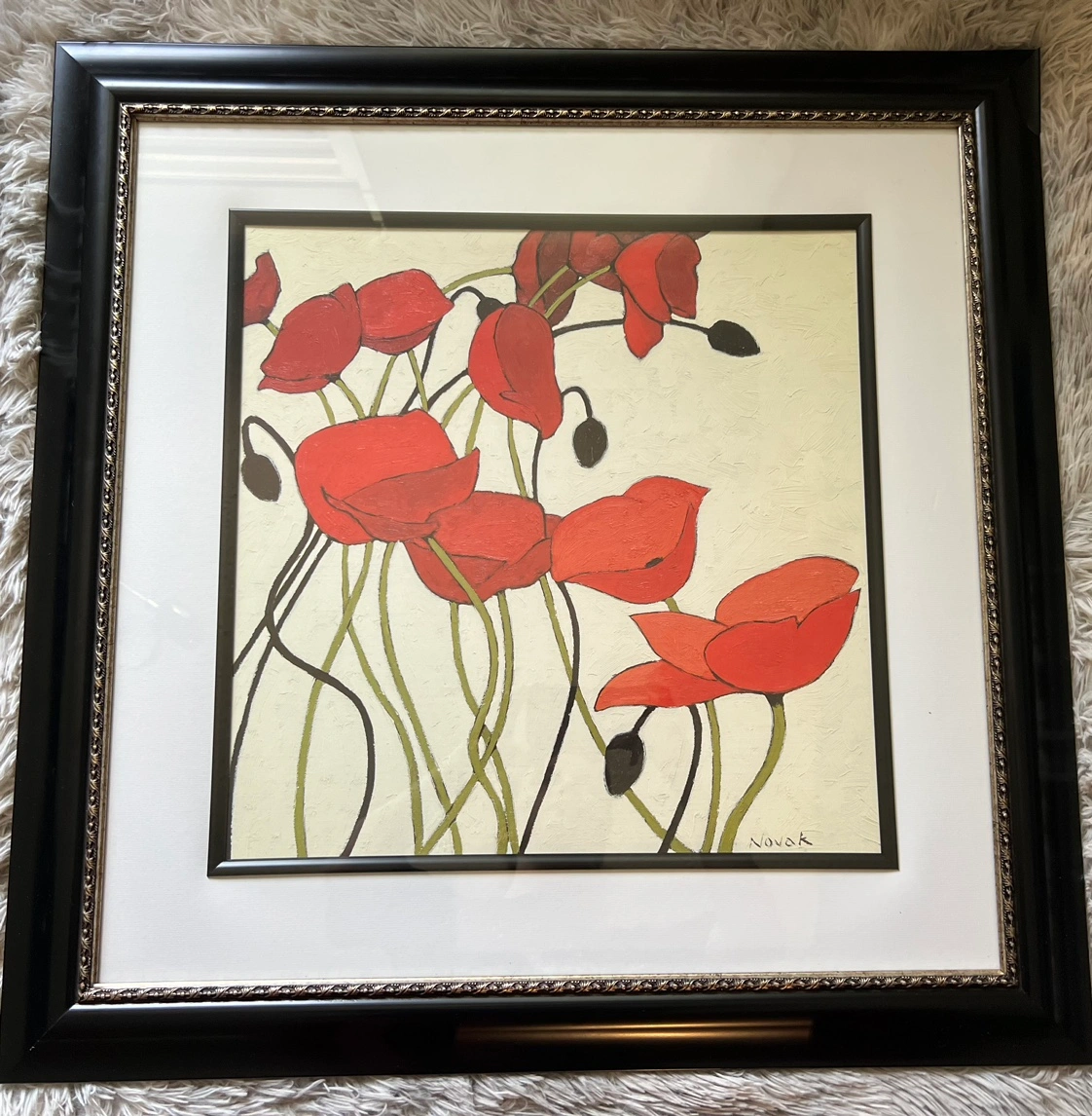 Framed oil painting featuring red poppies and signed "Novak" in the bottom right corner.