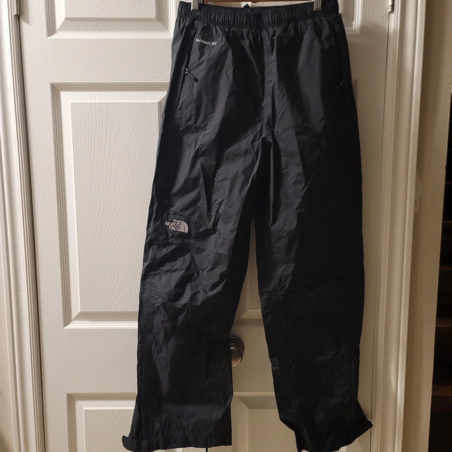 Medium size North Face snow pants in black. Features HyVent DT technology for waterproofing. Elastic waistband with a drawstring. Zippers on the leg openings.