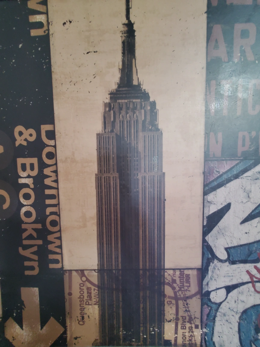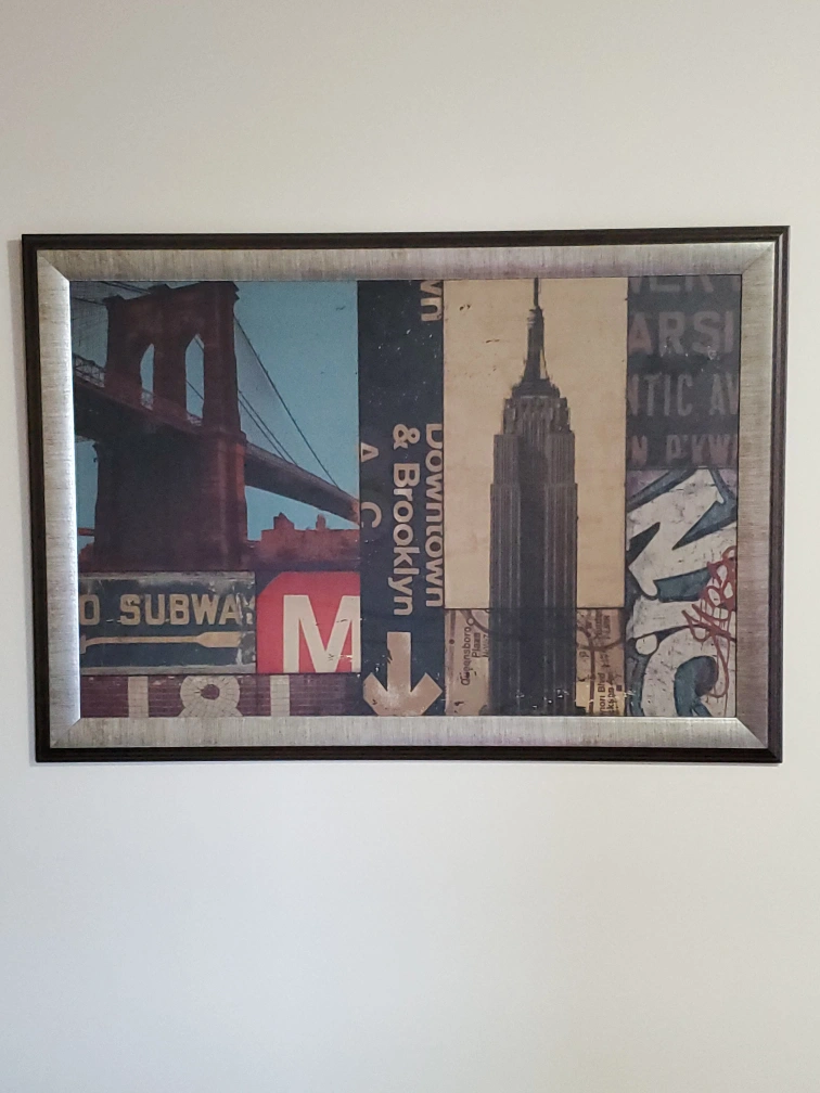 A framed picture of New York City featuring the Empire State Building, the Brooklyn Bridge, and graffiti art. Perfect condition!