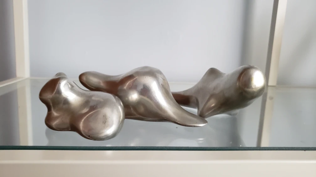188Three abstract aluminum sculptures. They are in the shape of an animal. They are signed on bottom with numbers. 1202 beaver 280 cat 987 seal Made by Hoselton Canada Take all 3 for 45.00 . A great deal. Ty for looking