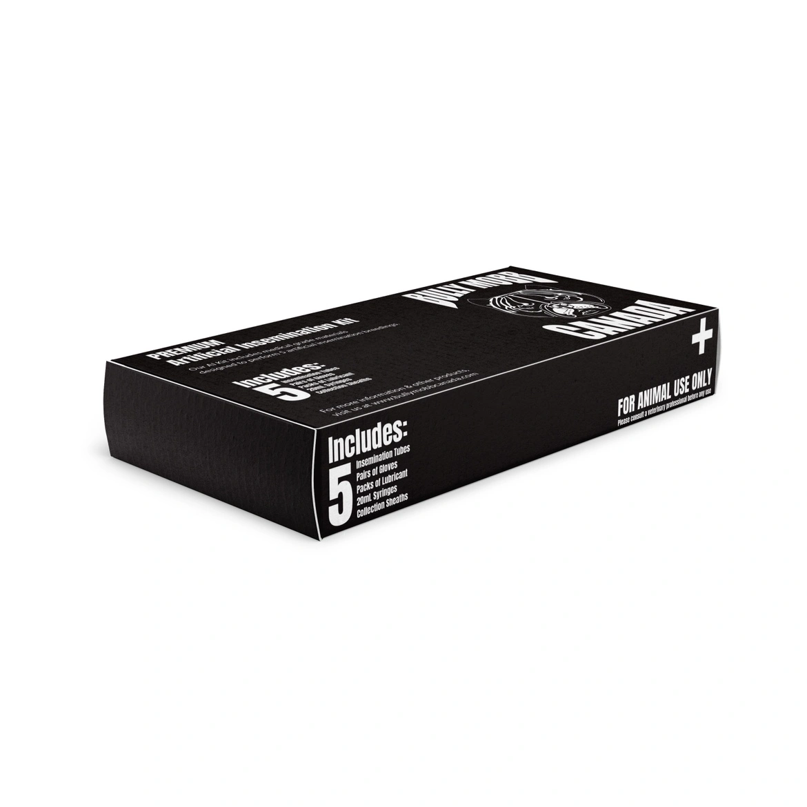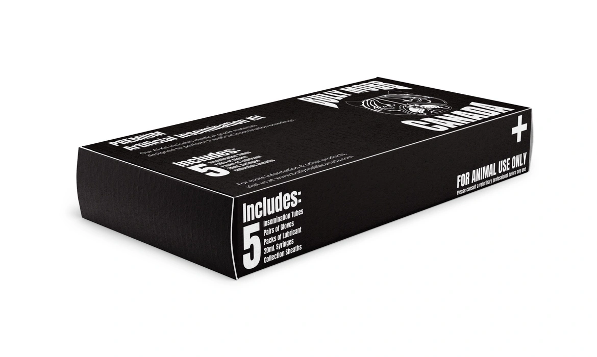 A kit for artificial insemination, including 5 insemination tubes, 5 pairs of gloves, 5 packs of lubricant, 5 20ml syringes, and 5 collection sleeves.