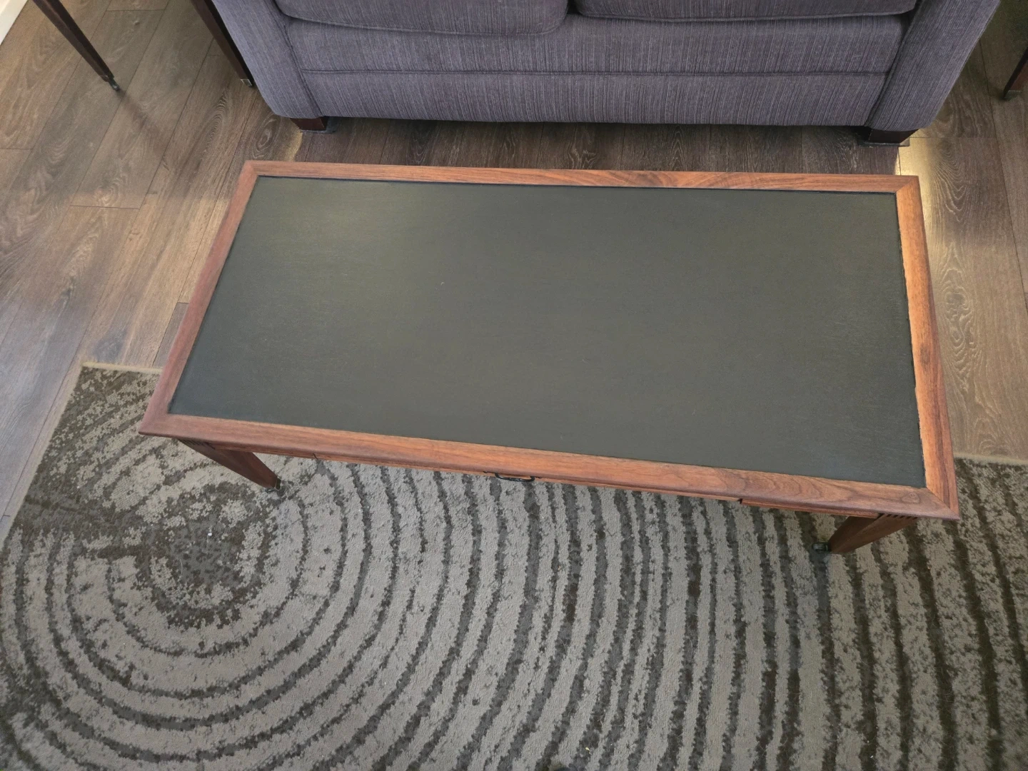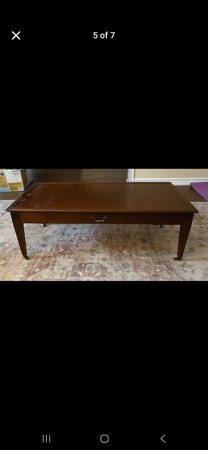 Lovely wooden coffee table featuring a dark inset top and a single drawer. It has a classic design that's been popular for years. The table's wood finish is a warm tone. Fully refurbished with castor wheels.