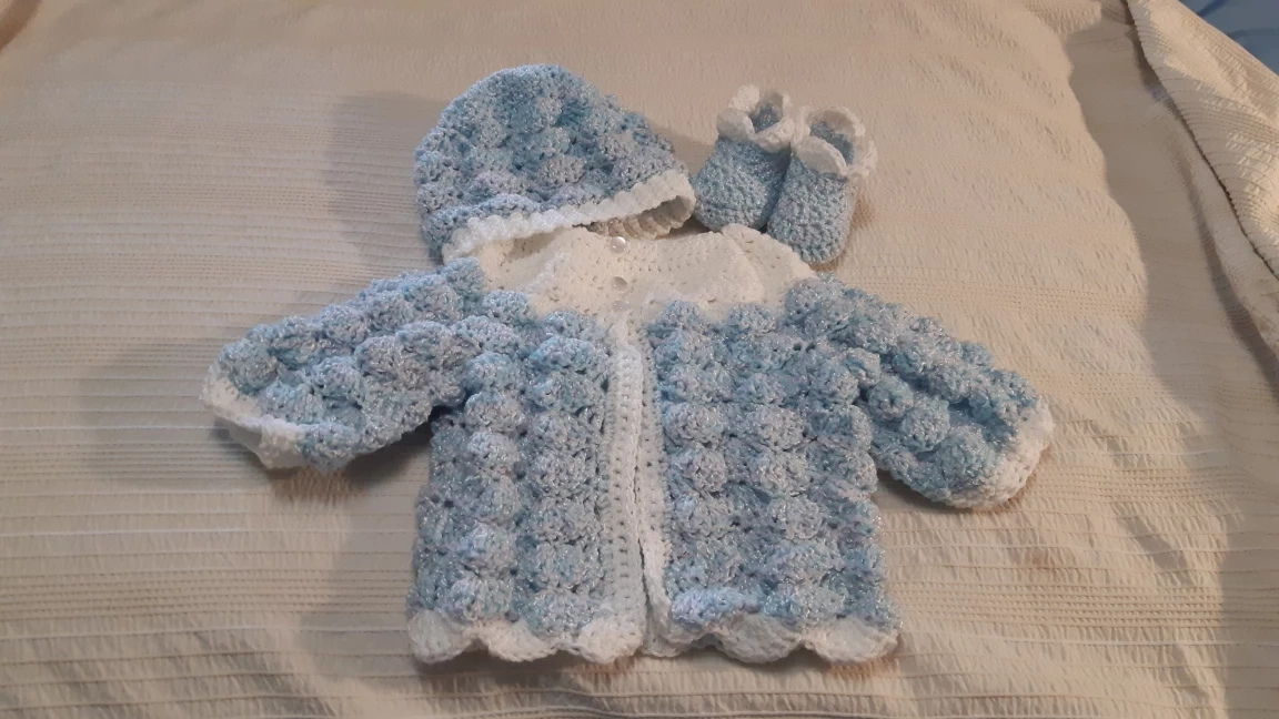 A handmade knitted baby outfit for a newborn girl, featuring a jacket, hat and booties in blue and pink varigated with white accent colour size 3- 6 months. I also do custom orders sizes newborn to 18 months