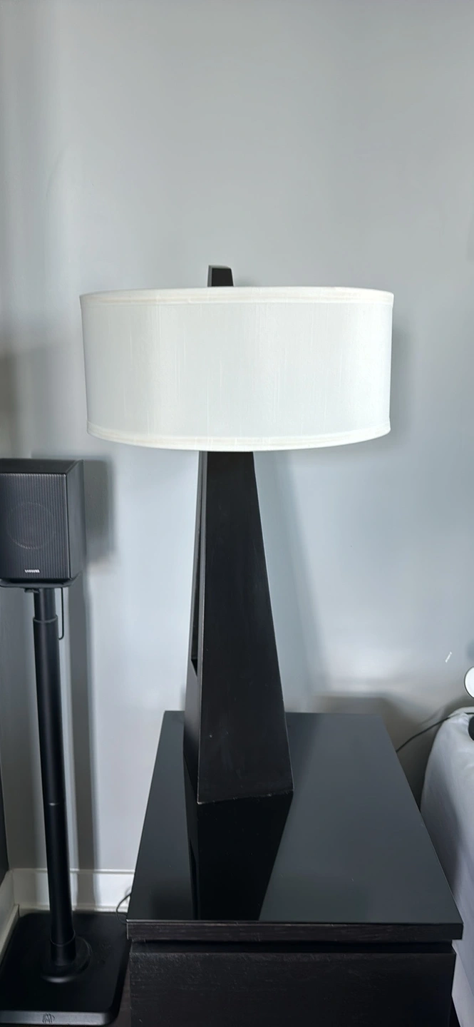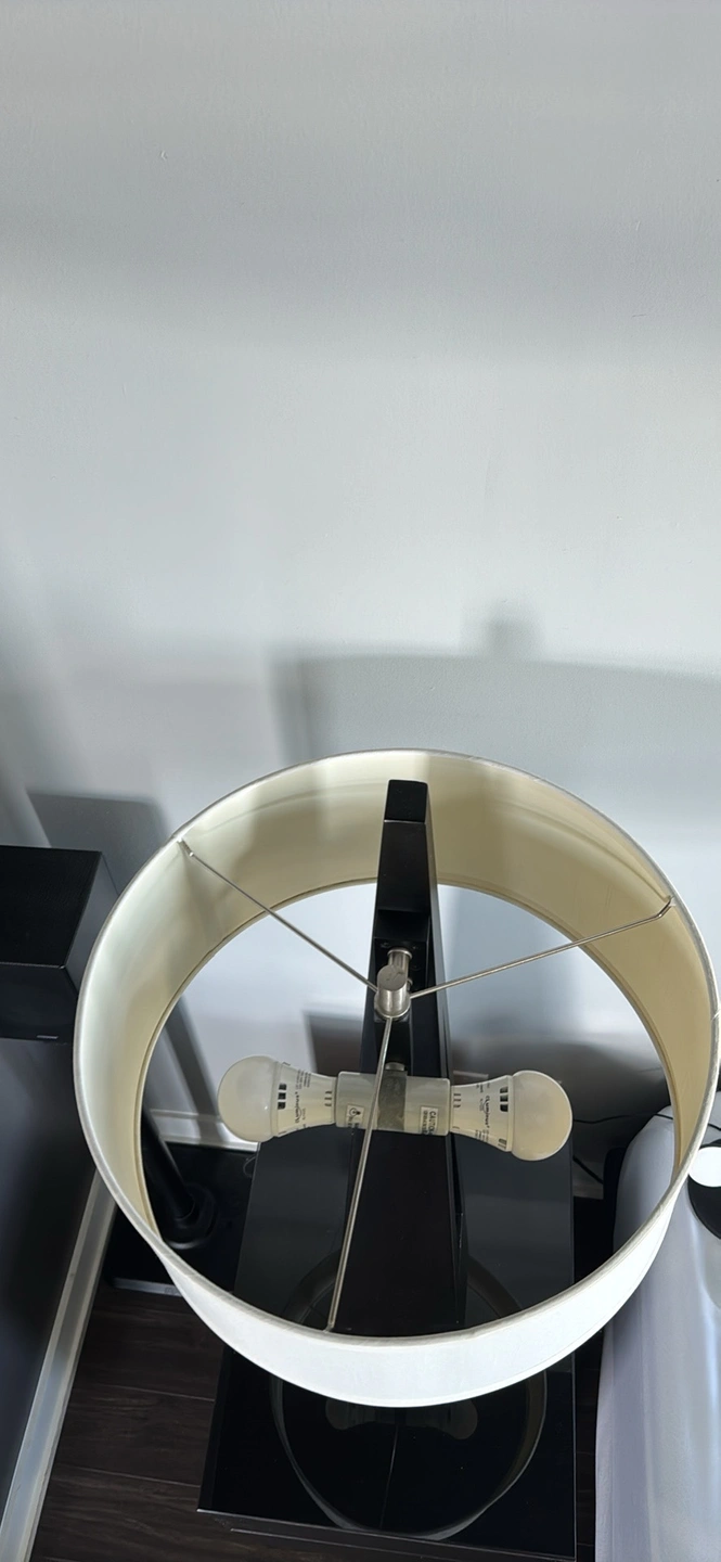 Black table lamps with white drum lampshade. The lamp has a sleek, modern design.