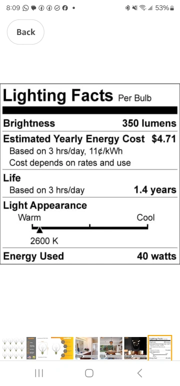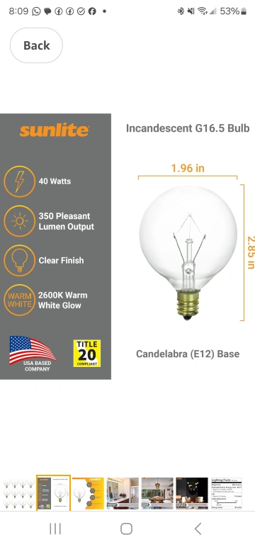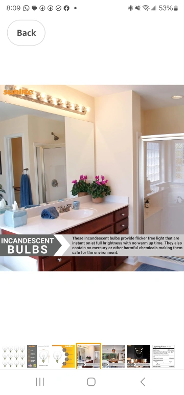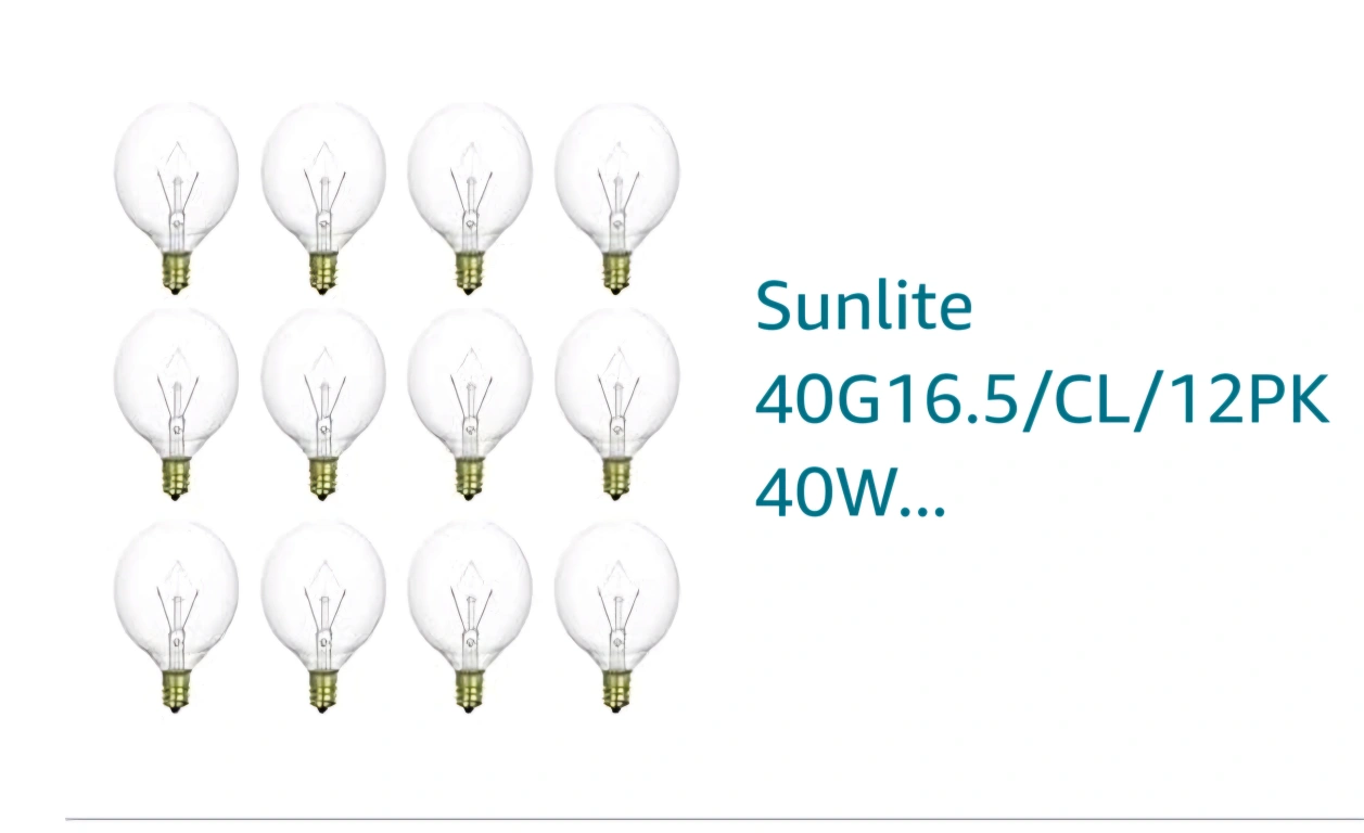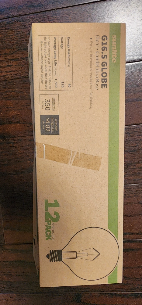 931Bathroom vanity lightbulbs. Unused 12 pack of Sunlite 40 Watt 40W G16.5 Candelabra light bulbs - Brand new. They are clear finish with a warm white glow. Puchased the wrong size, but waited too long to return. One bulb arrived broken; so 11 in the box as shown. Flicker-free, mercury-free, dimmable. Brand new, never used. paid $35. Asking $20 OBO.
