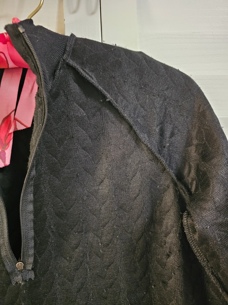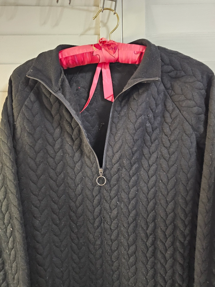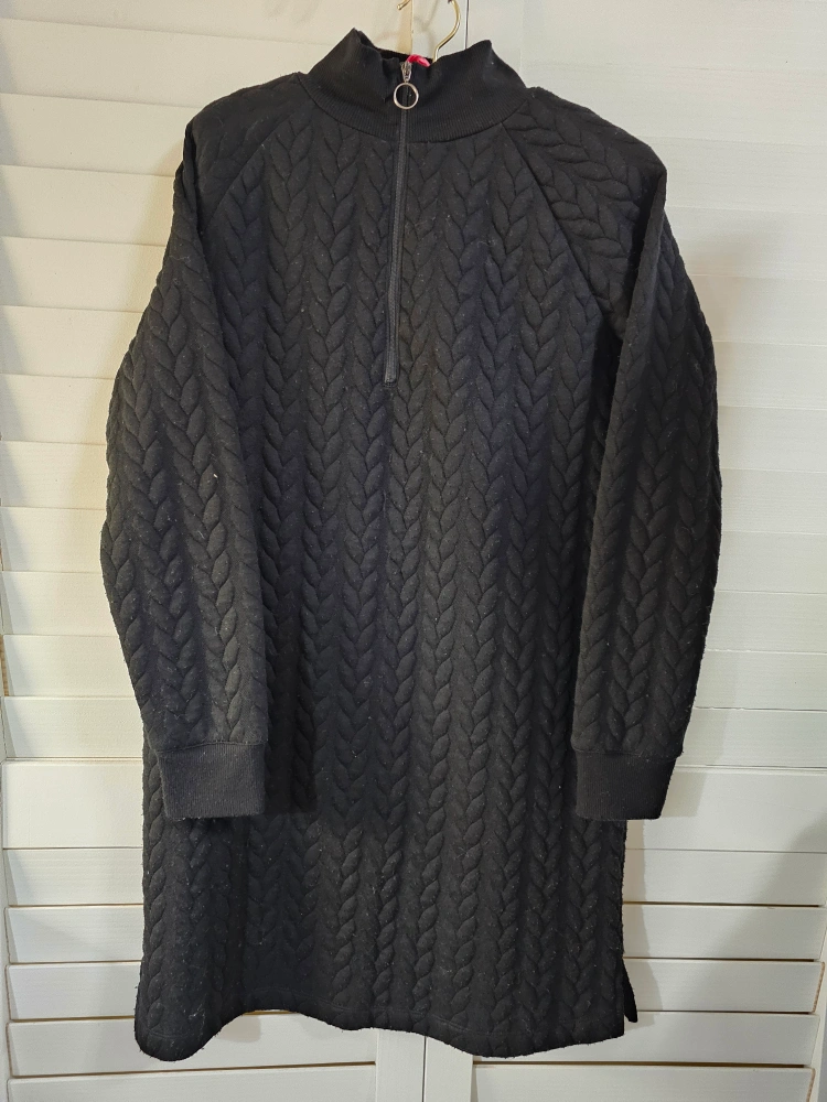 1000+A black tricot sweater dress with a quarter zip and long sleeves.