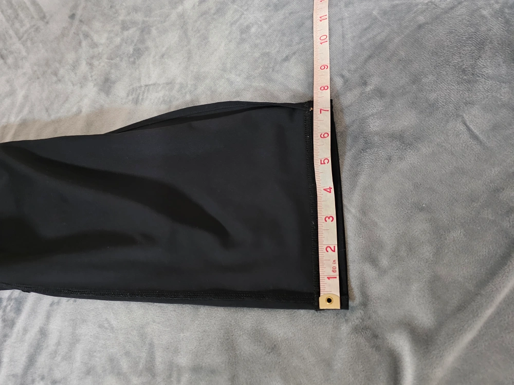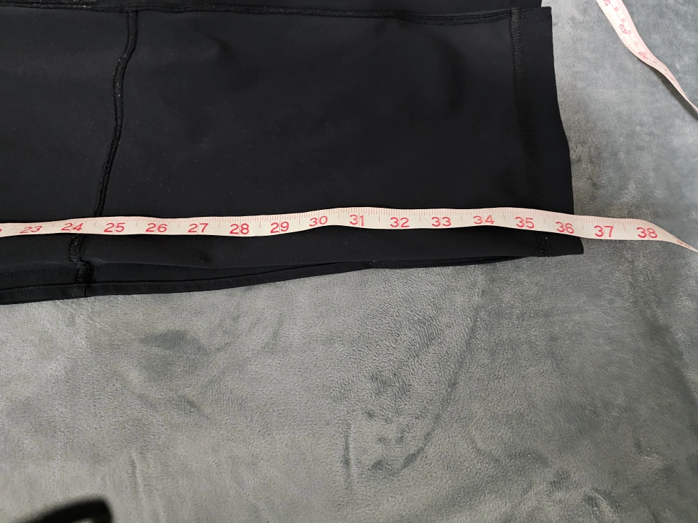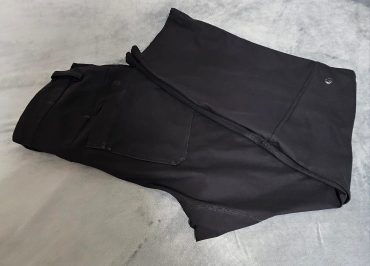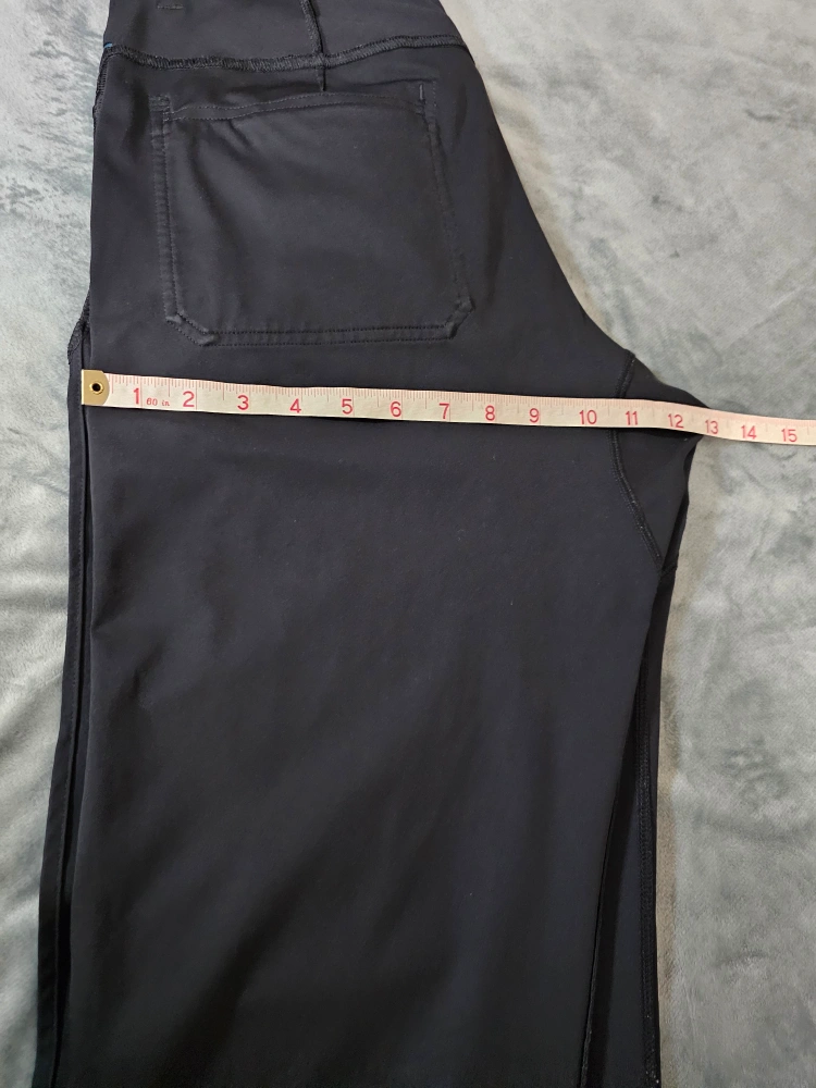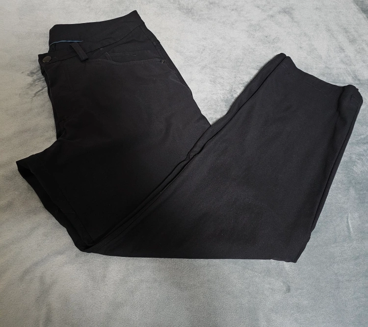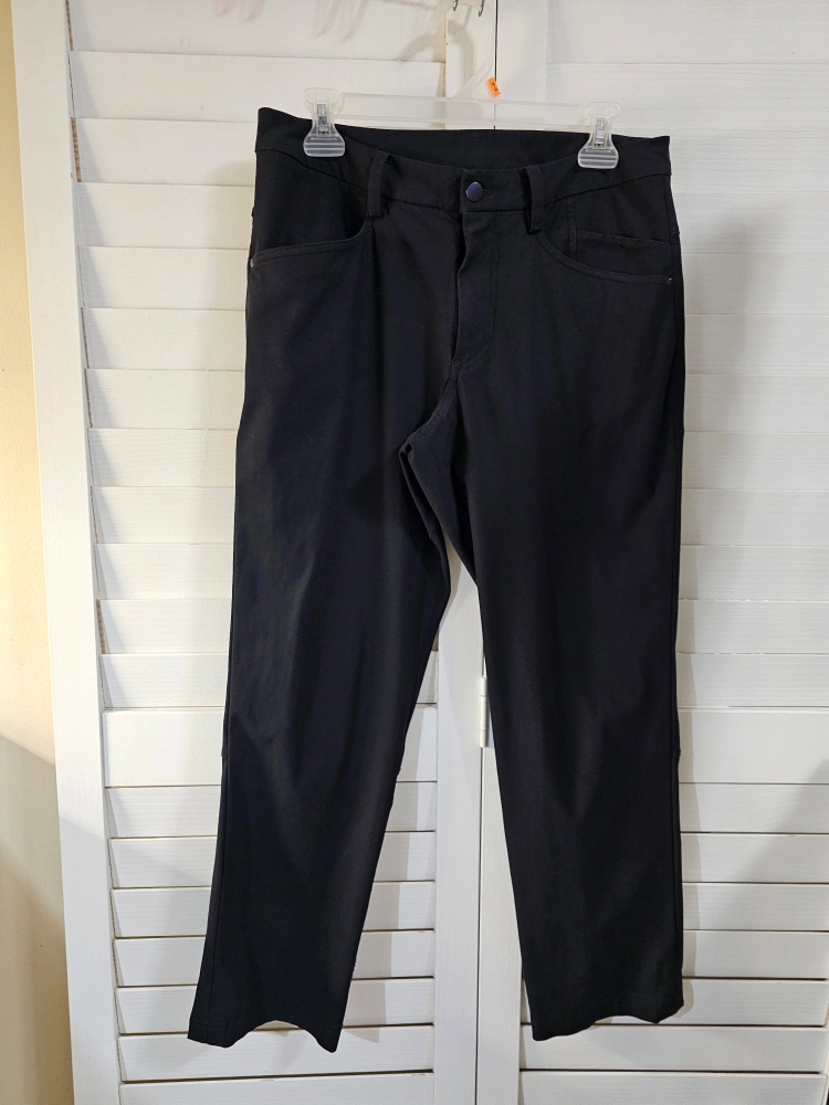 Black pants with a straight leg and a zipper fly. They have a small Lululemon logo on the right leg. have 6 pockets. it has a hole on one of the belt straps