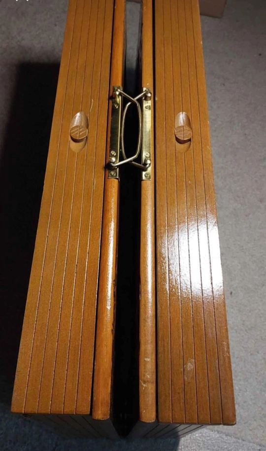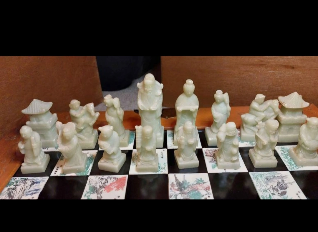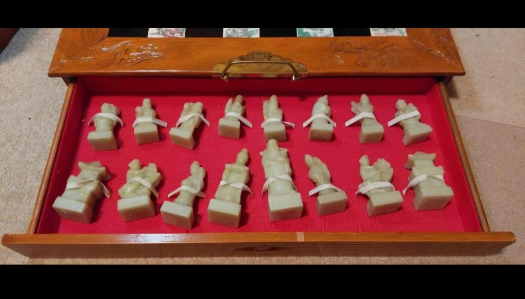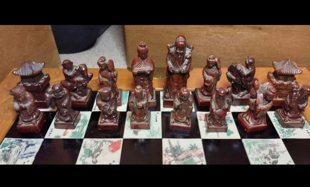 This Chinese chess set is made from wood and features beautiful artwork. The set comes with a wooden carrying case with a hinged lid. The set includes a total of 32 pieces.
