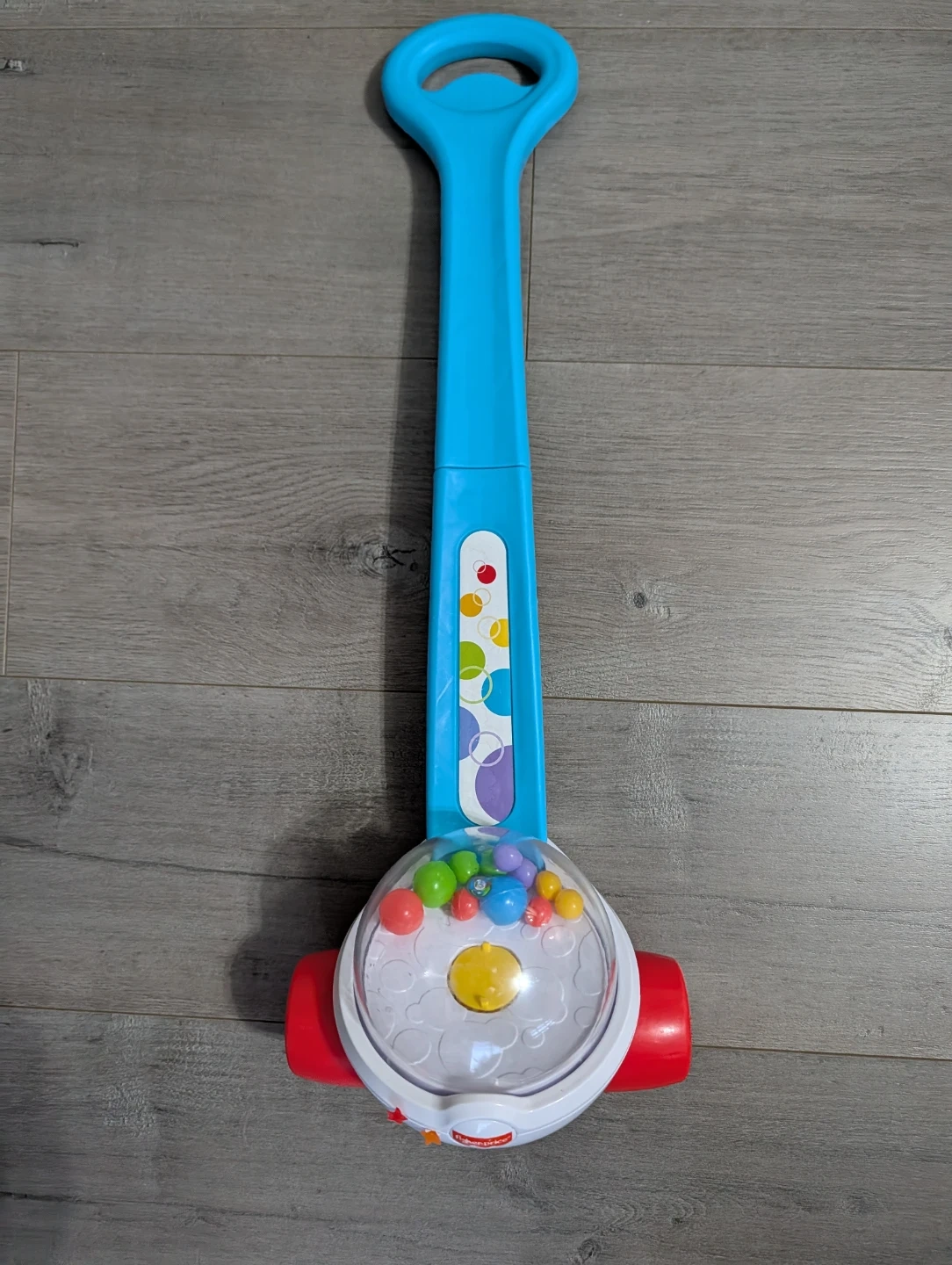 This Fisher-Price baby walker features a fun, colourful design with a clear dome that holds colourful balls. It's designed for little ones learning to walk and play. The walker has a large blue handle for pushing and red wheels.