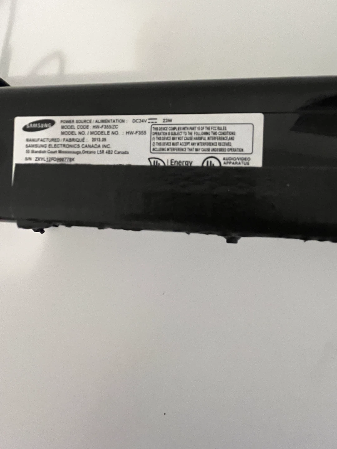 This is a Samsung HW-F355 soundbar. It operates on DC24V with a power consumption of 23W. This soundbar is manufactured by Samsung Electronics Canada Inc. It's a black soundbar that's great for enhancing your audio experience. Has USB port. No HDMI port.
