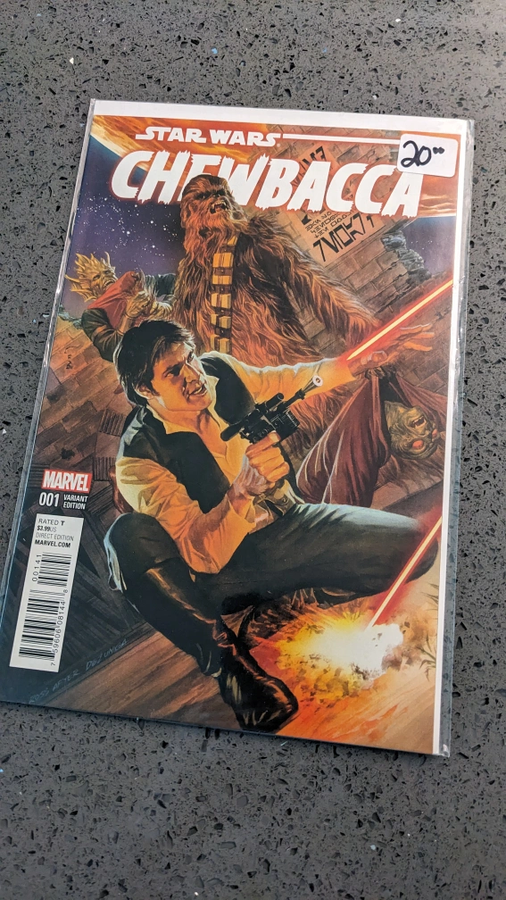 751Star Wars Chewbacca (2015) Issue #1 Marvel Variant Cover (Alex Ross) "Limited 1 for 50 Retailer Incentive Variant Cover. Written by Gerry Duggan. Art by Phil Noto. Cover by Alex Ross. Known as the skilled co-pilot of the infamous Millennium Falcon, the legendary Wookiee warrior CHEWBACCA will star in his very own limited comic series! After the battle of Yavin, Chewbacca is on his own when he crash lands his ship on an Imperial occupied planet. Now stranded, Chewie finds himself caught in the middle of trying to return to the rebellion and helping a young and feisty girl in need. 28 pages, full color."