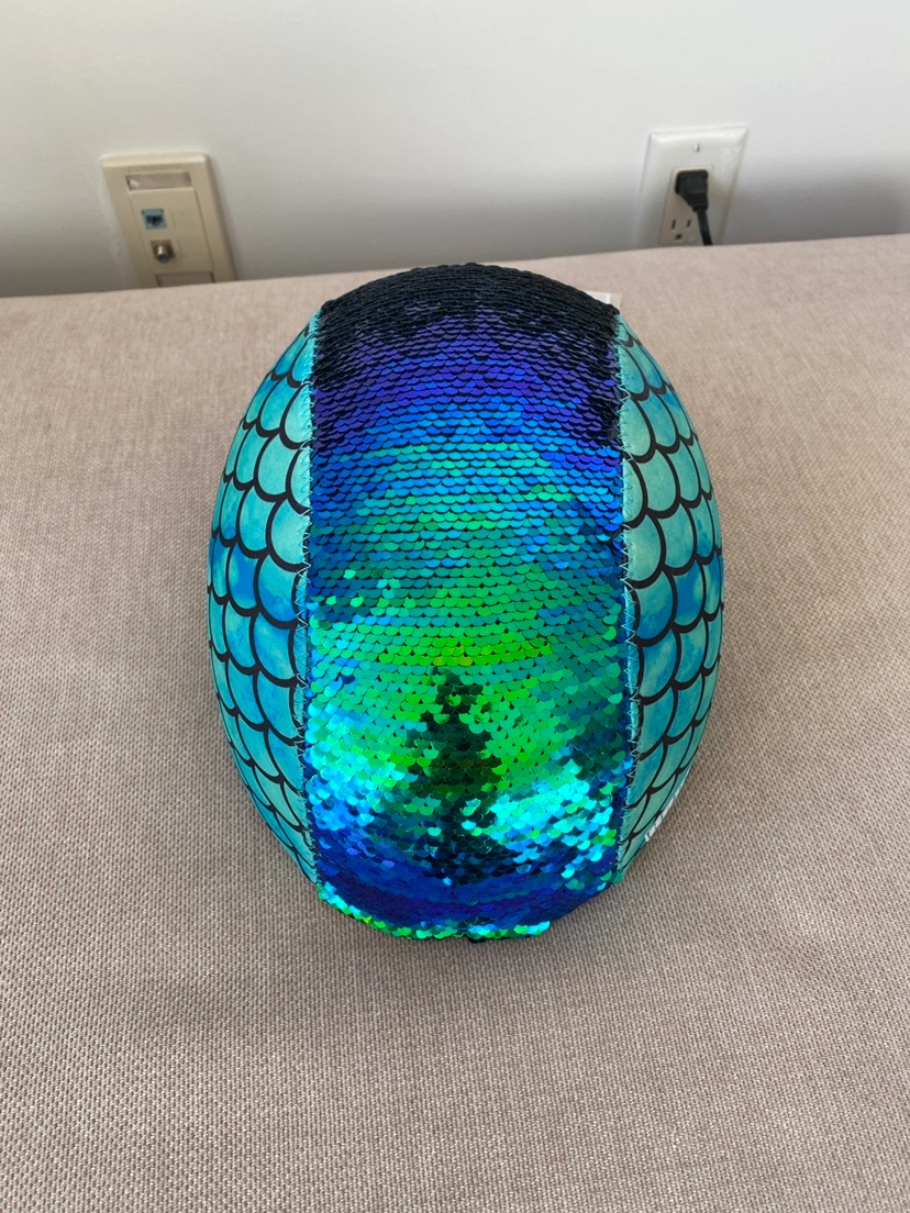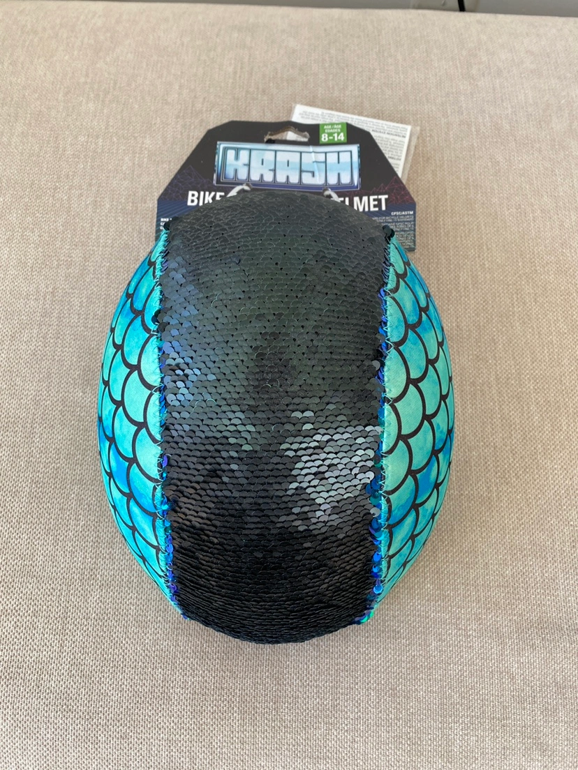 Brand new bike and skate helmet. It's mermaid themed and the scales can be switched from black to the shiny blue & green (see pictures). The shiny side can be blue or green depending on lighting and your viewing angle. Struggling to let this one go since I still think it's pretty cool, but I keep using the same helmet I already have and I dont wanna be a hoarder lol.