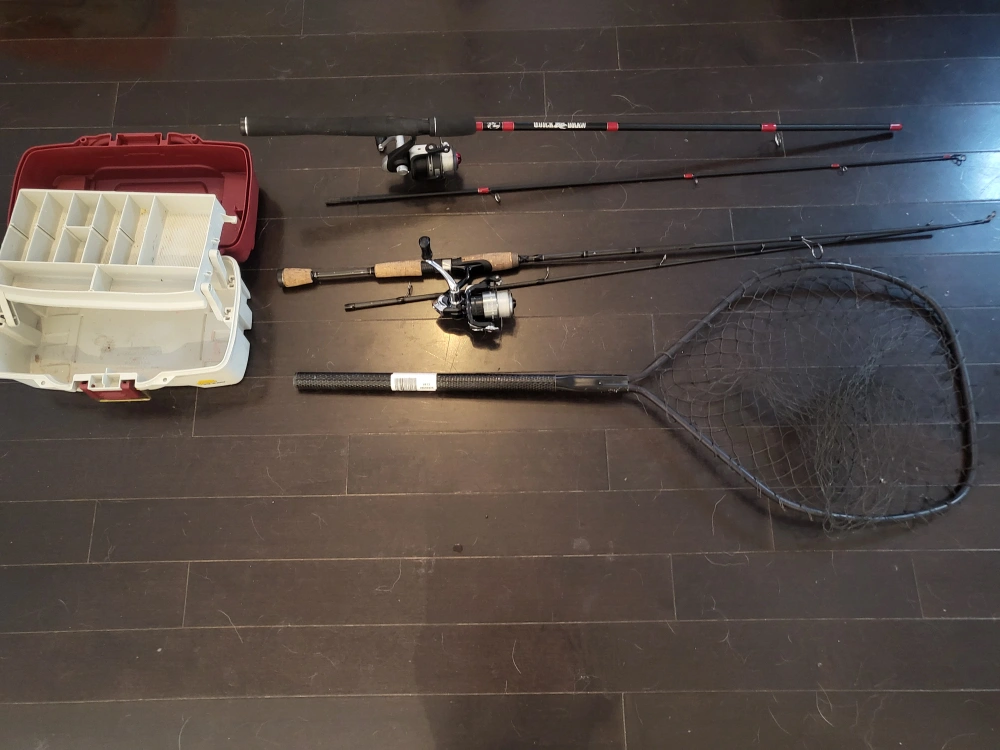 Two fishing rod and reel combos, a landing net, and a tackle box. One rod and reel combo includes a Shimano Sienna reel. The other rod and reel combo includes a quick draw reel. The rods are both in good condition, and the reels are in working. got all from bass pro