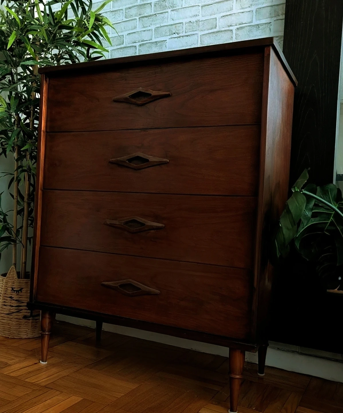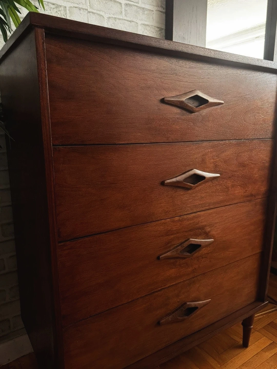 Carved drawer pulls with drawers which slide smoothly with dovetail sides.