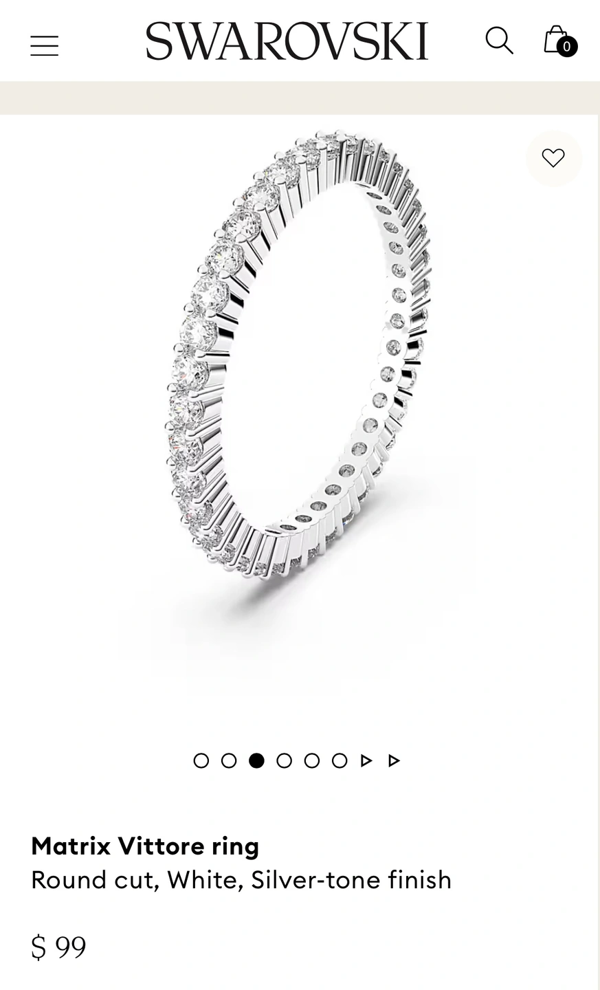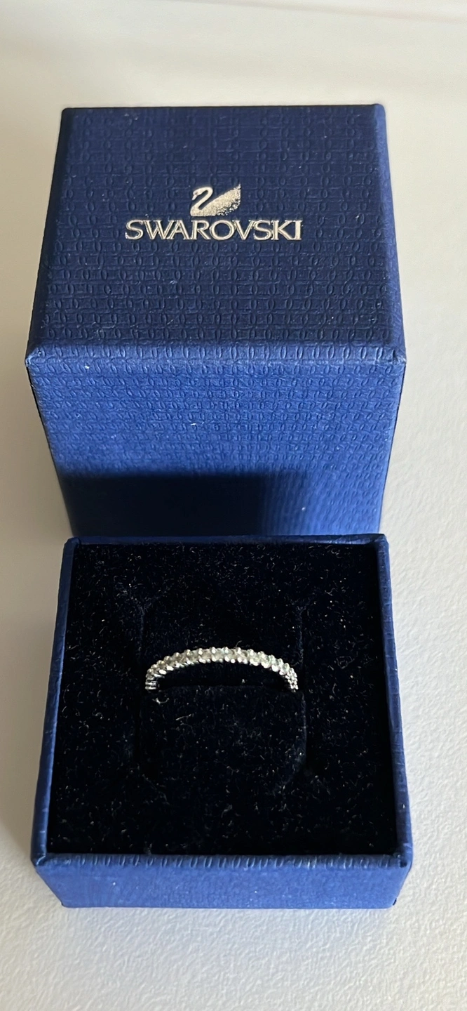 Swarovski ring with silver tone finish. Comes with the original box. No stones missing. Size 55. See images for sizing chart.