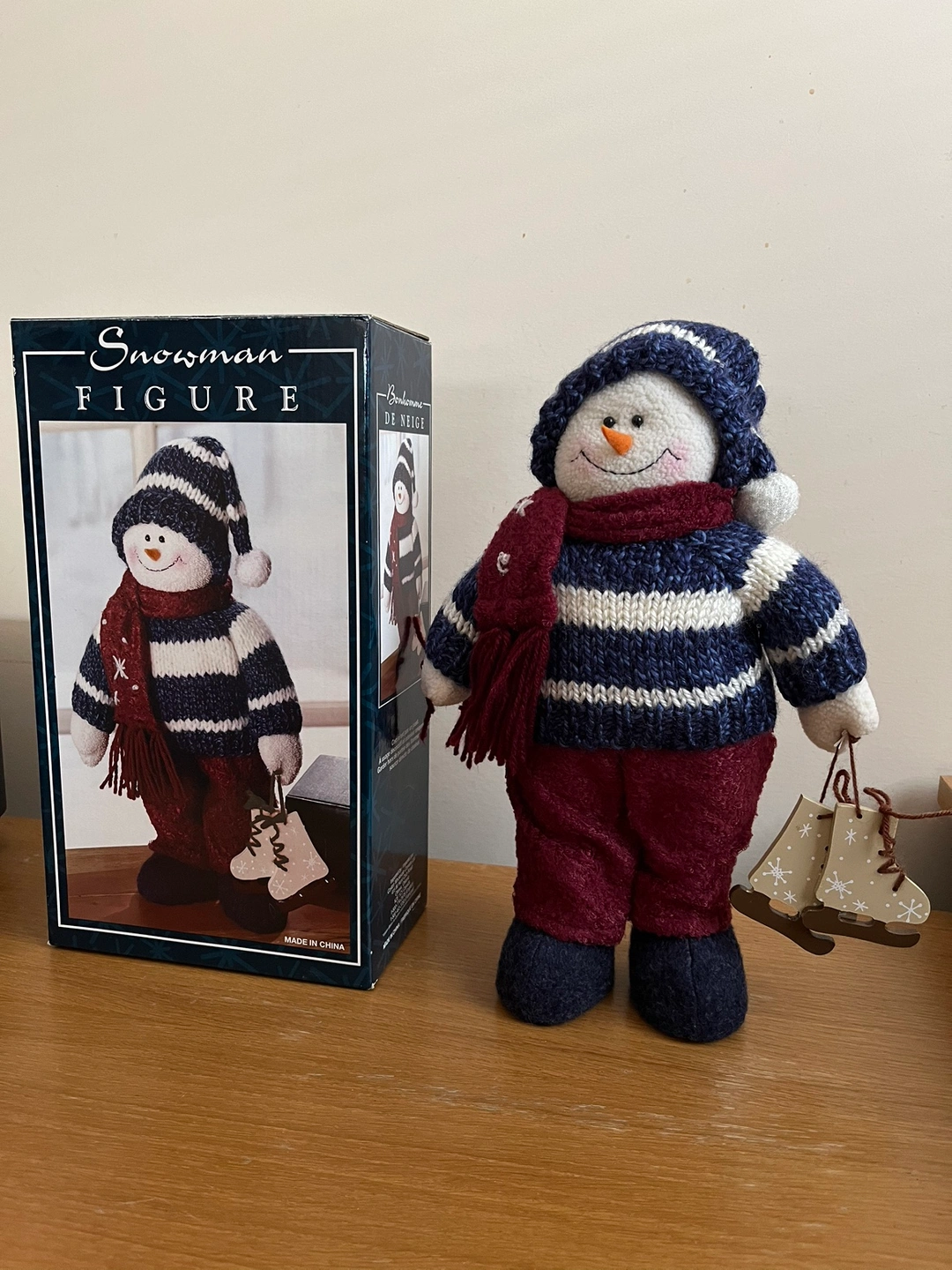 13 inch tall snowman figure with a red scarf and blue and white sweater. He is holding a pair of ice skates. Comes in original box. If the ad is up, the item is available.