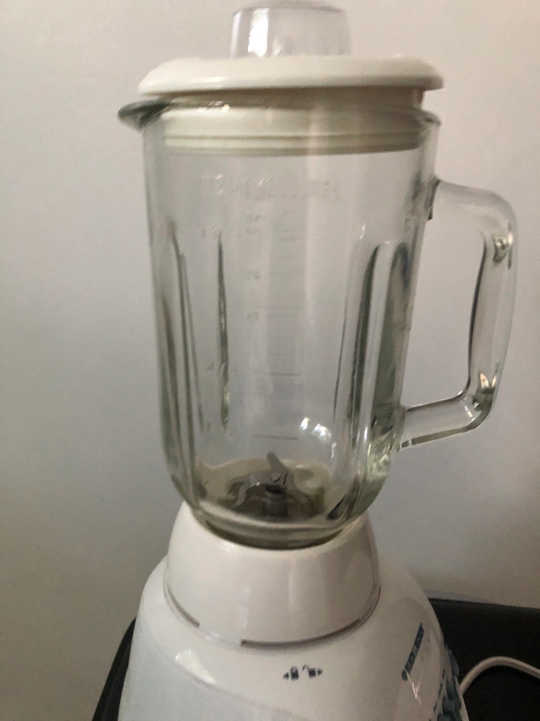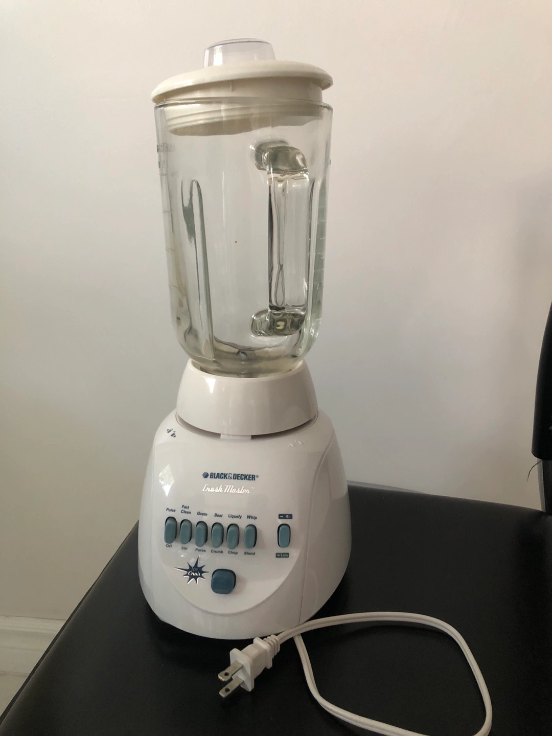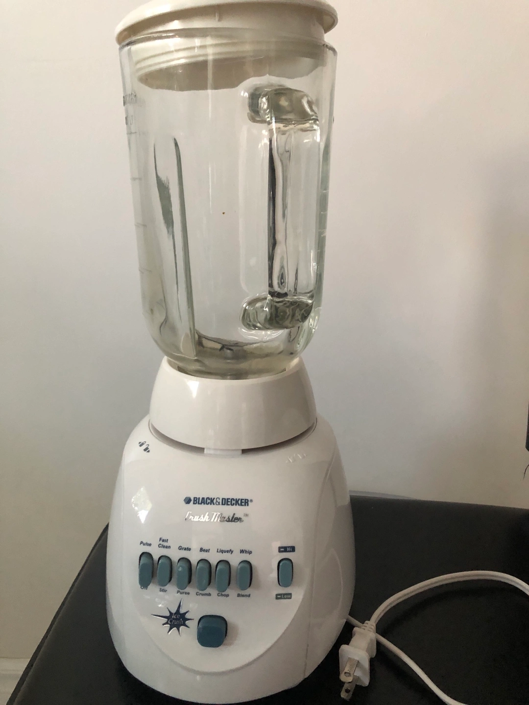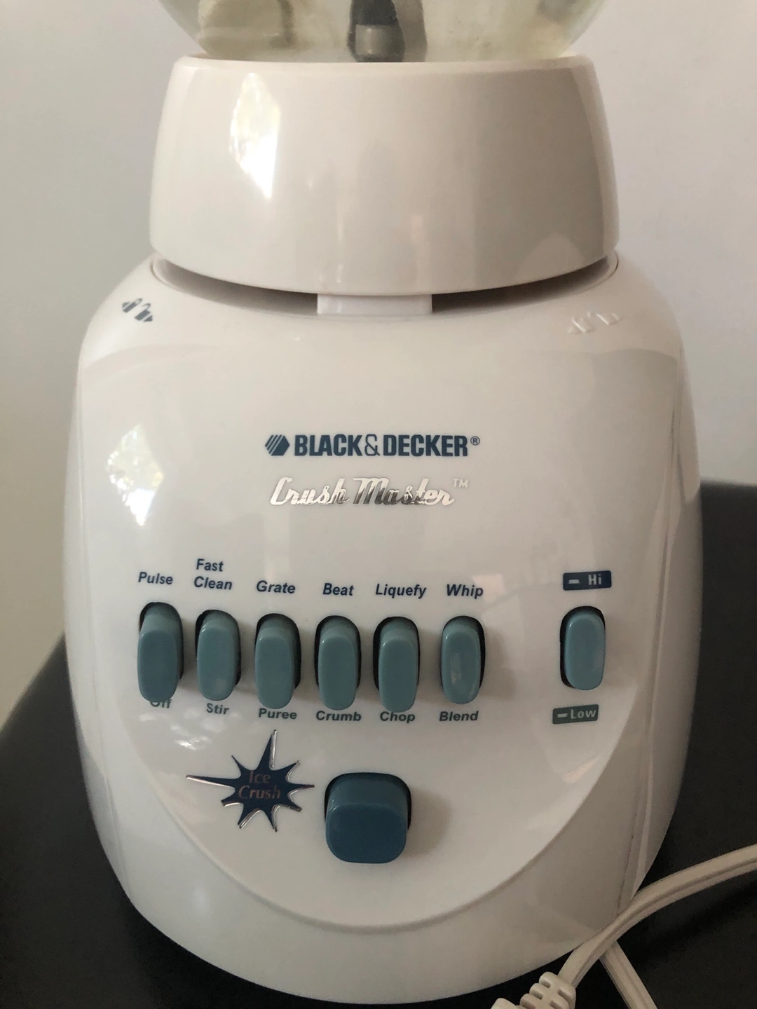 83Black & Decker Crush Master blender. Comes with a glass jar and lid. It has multiple settings including pulse, fast clean, grate, beat, liquify, whip, stir, puree, crumb, chop, and blend. It has a "ice crush" button for crushing ice. It comes with a power cord.