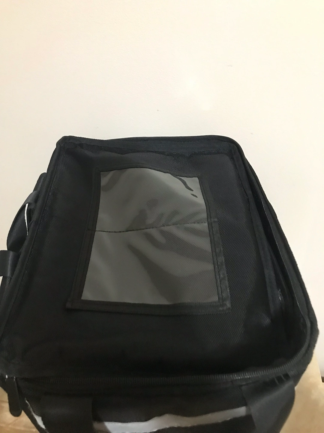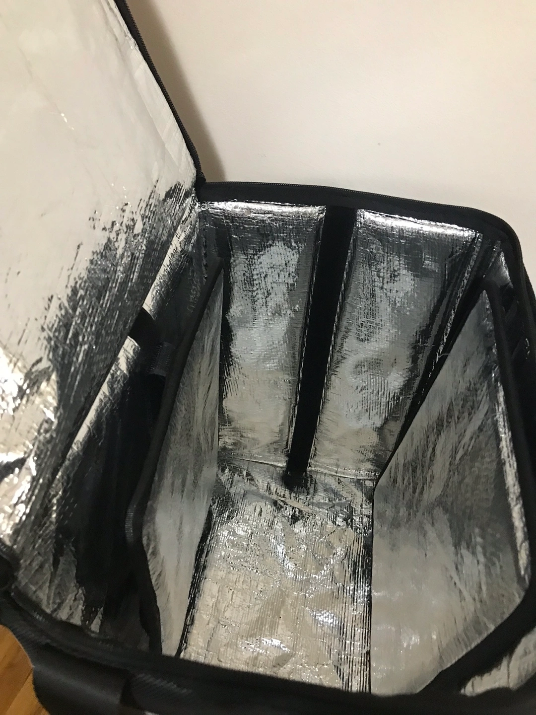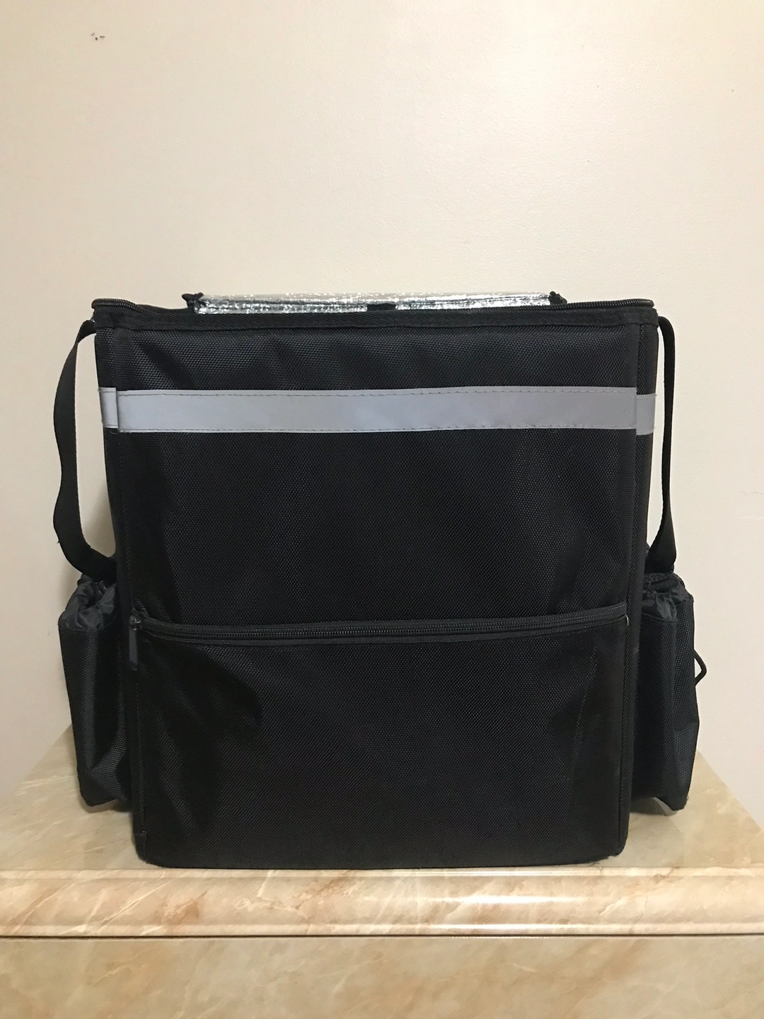 Black insulated delivery bag with multiple pockets. It can be carried by hand, on the shoulder or as a backpack. It has reflective strips on the front and back. Used couple of times.
