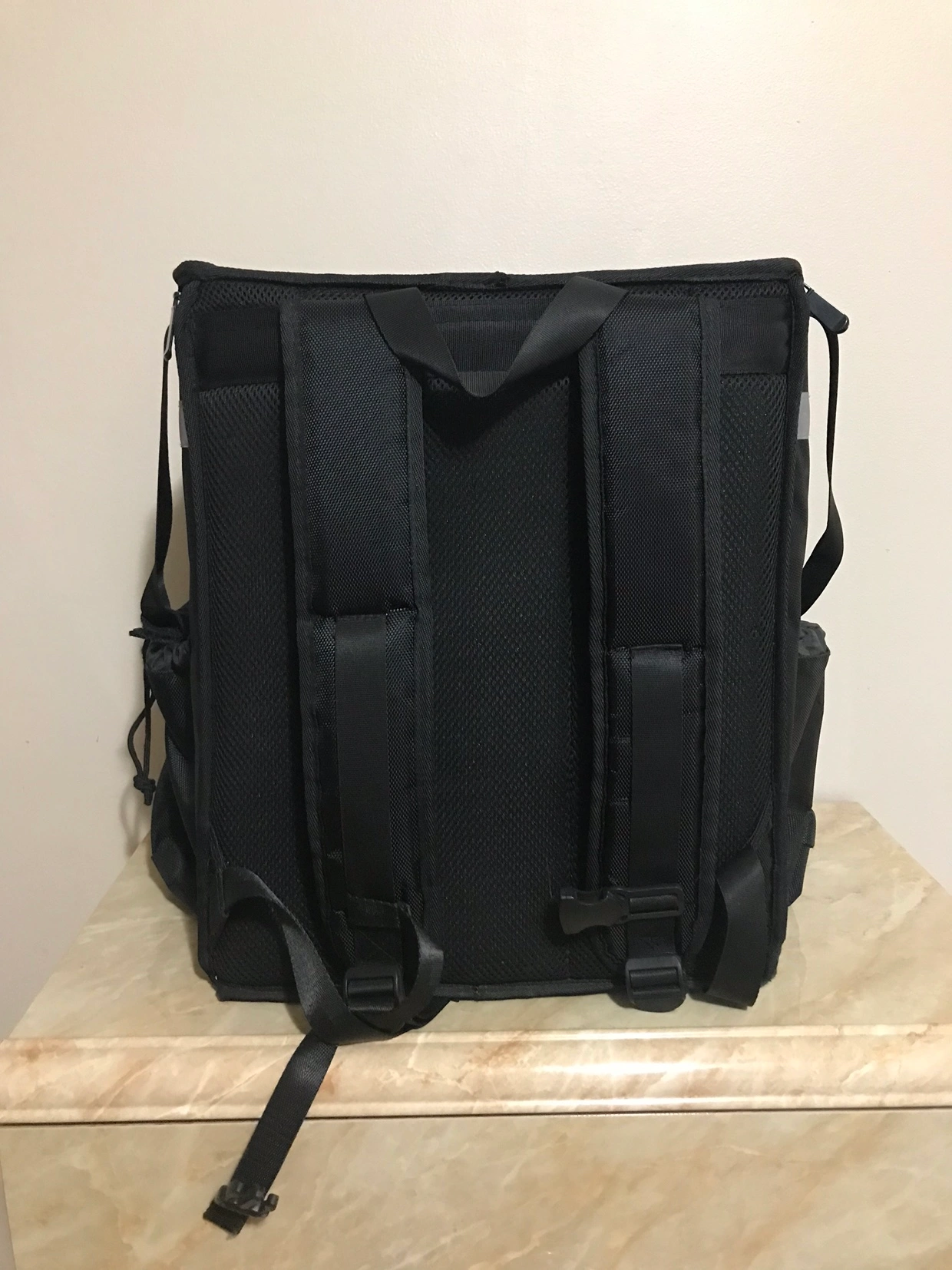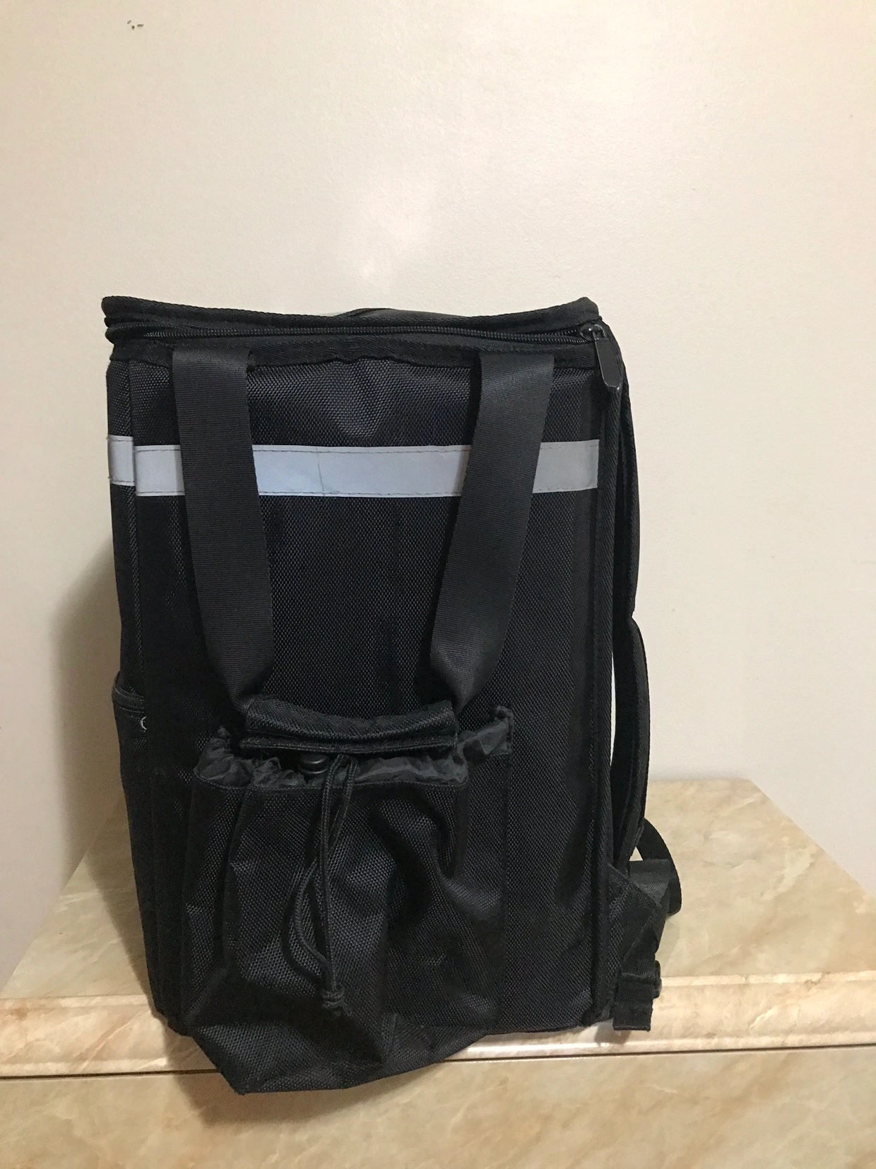 Black insulated delivery bag with multiple pockets. It can be carried by hand, on the shoulder or as a backpack. It has reflective strips on the front and back. Used couple of times.