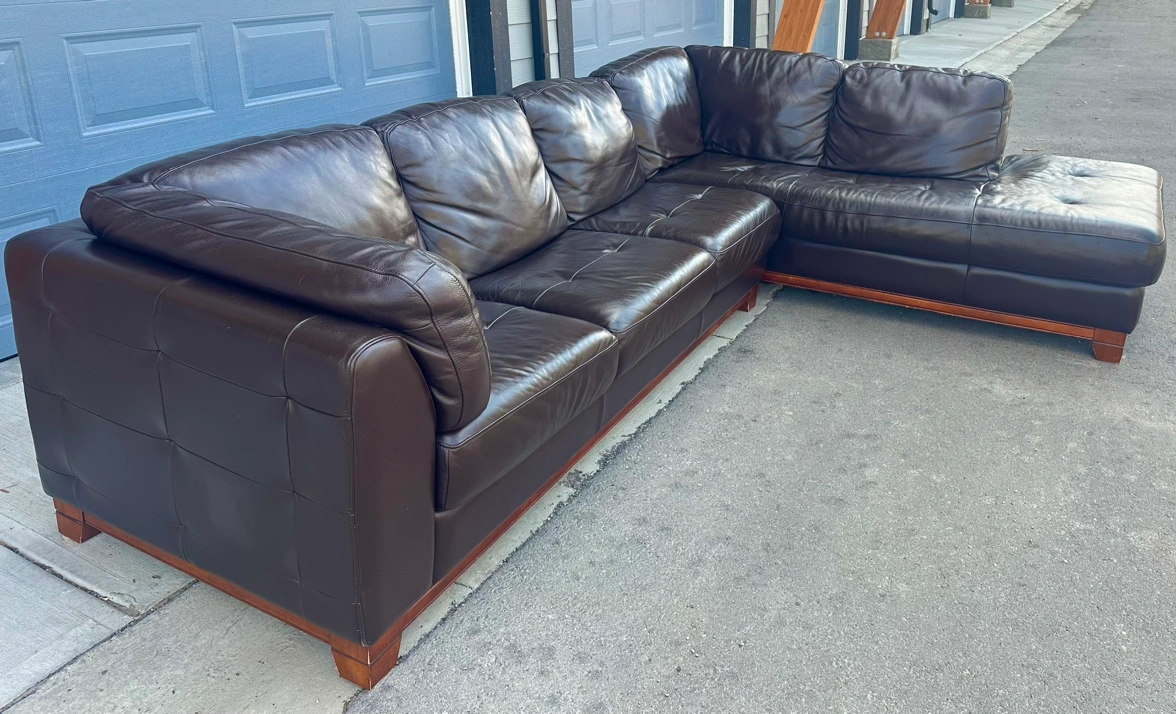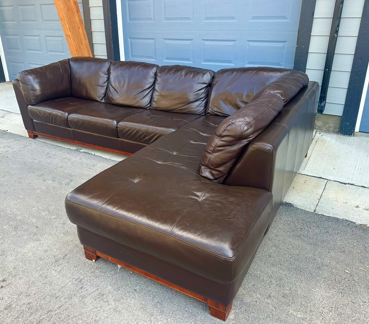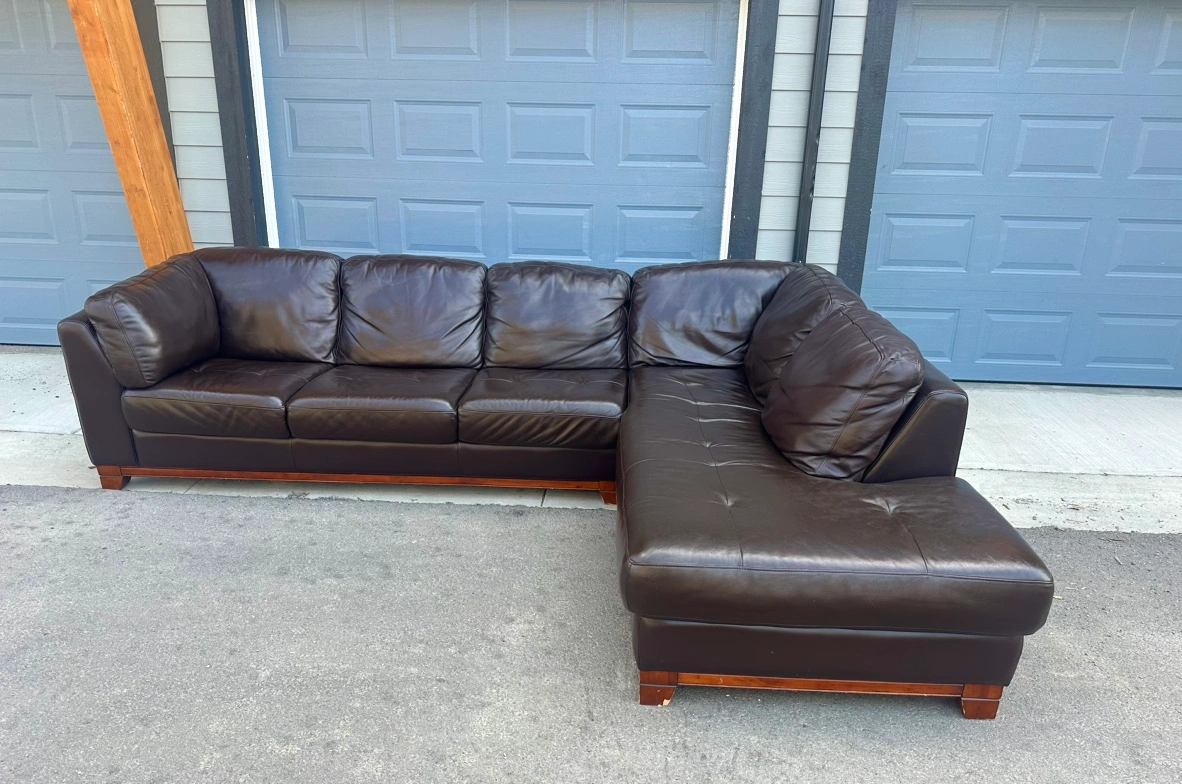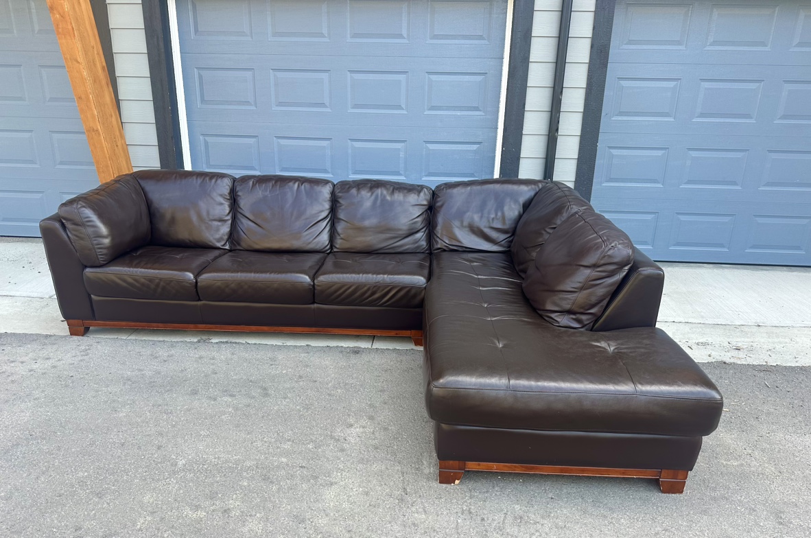 Dark Brown leather sectional sofa with a chaise lounge in a good condition,it’s a stickley couch,from another smoking and pet free home.
