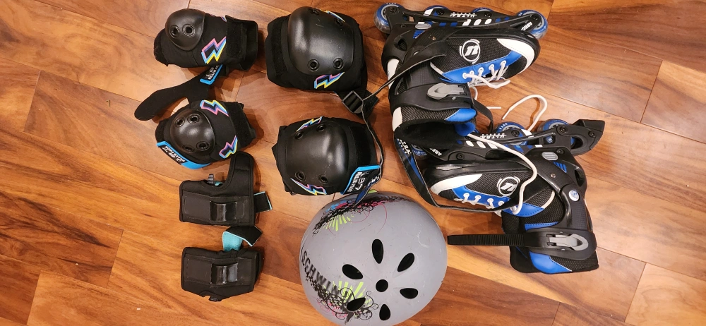 Inline skates, helmet and knee and wrist pads are included. They are a great beginner set for kids. The skates are size 7. All items are in good condition.
