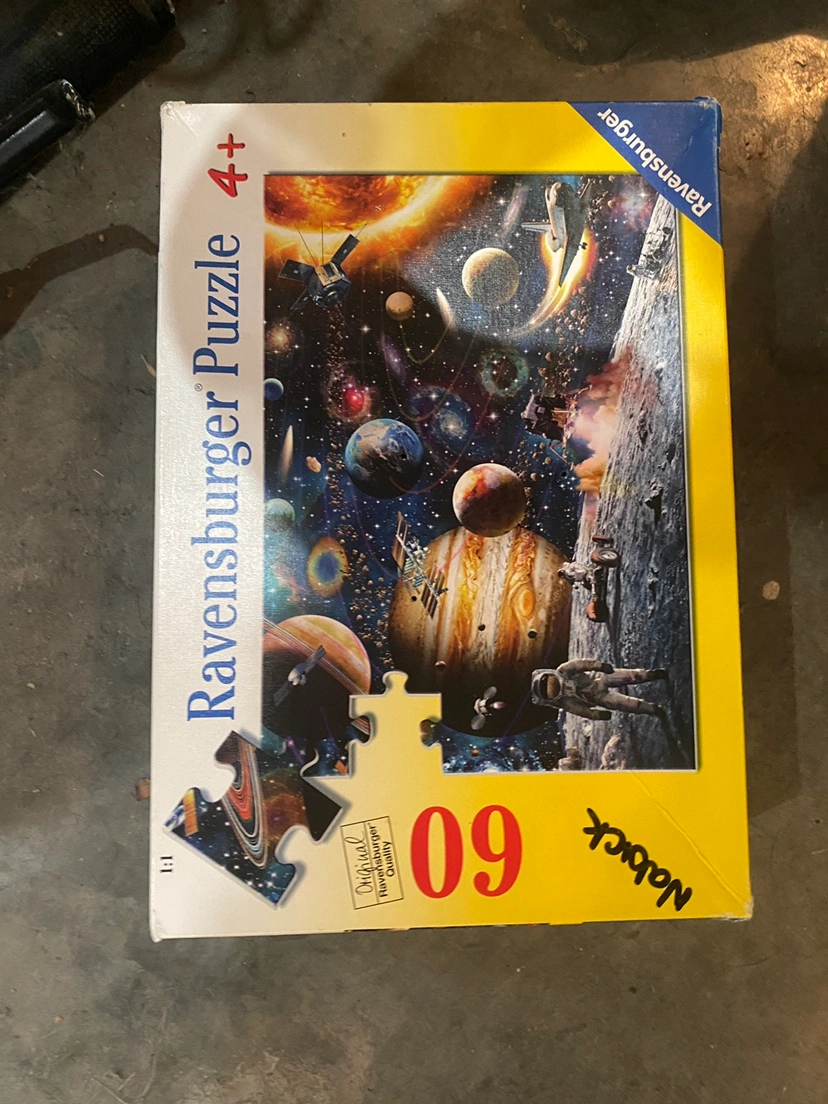 This is a Ravensburger puzzle for ages 4+ with 60 pieces. It is a space themed puzzle, featuring planets, stars, and astronauts. The box is in good condition.
