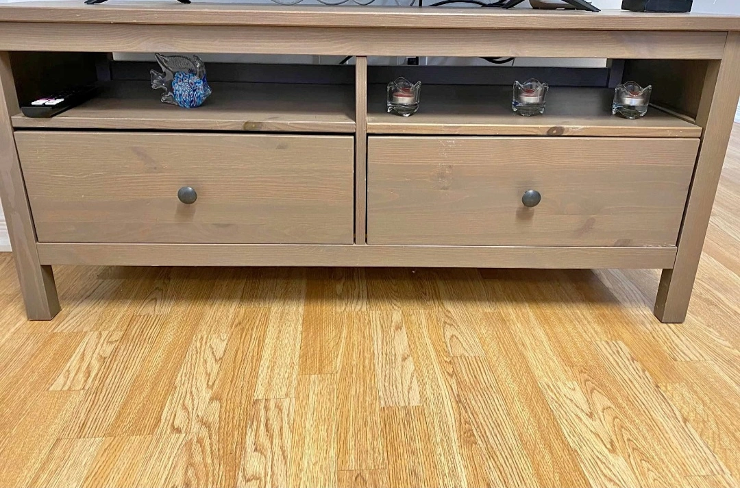 A TV stand with two drawers and a shelf. The stand is made of wood and has black metal drawer pulls. It is in good condition and would be perfect for any living room.