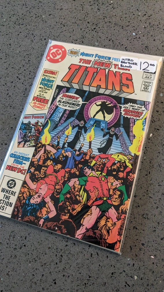 "Direct Edition. It's the intro of Brother Blood as the Titans infiltrate his church in "Beware The Wrath Of...Brother Blood!" Part 1 of 2, continued next issue. Script by Marv Wolfman, pencils by George Perez, inks by Romeo Tanghal. The Monitor cameo. Bonus 16-page story: The Night Force premiere in a tale by Wolfman, Gene Colan and Bob Smith. Perez cover. 1st appearance (shadowy) of The Monitor."