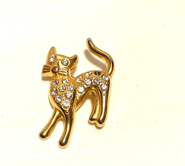22Gold toned brooch featuring a cat with rhinestones. The brooch is in good condition.