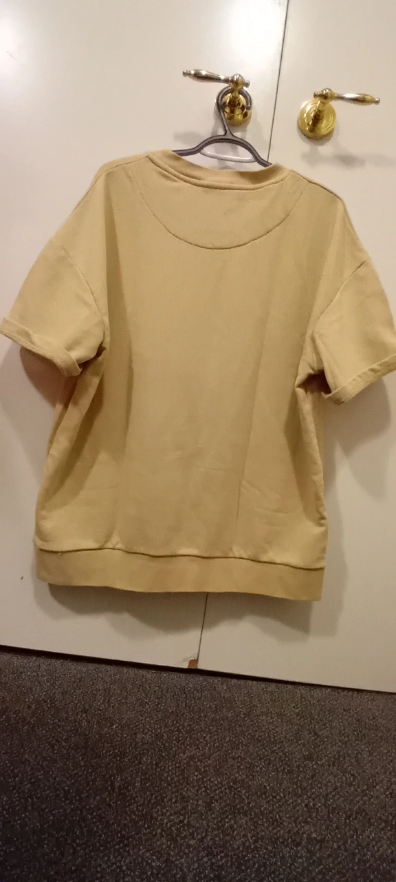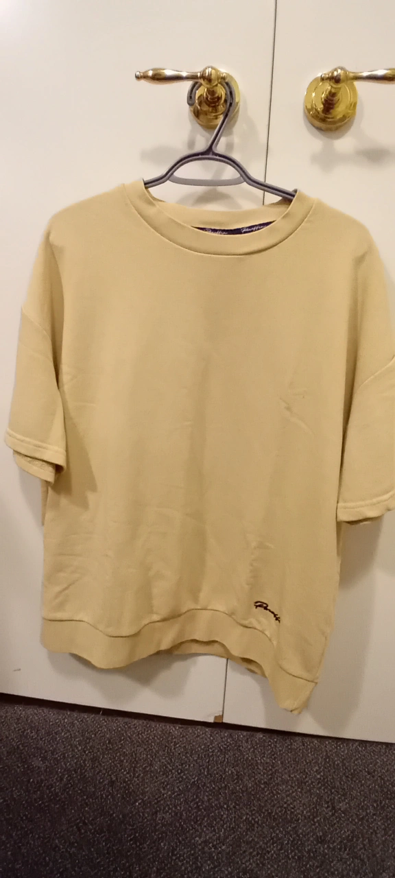 289This shirt is a light yellow colour. It has short sleeves and a crew neck. The shirt is made of a soft, comfortable material.