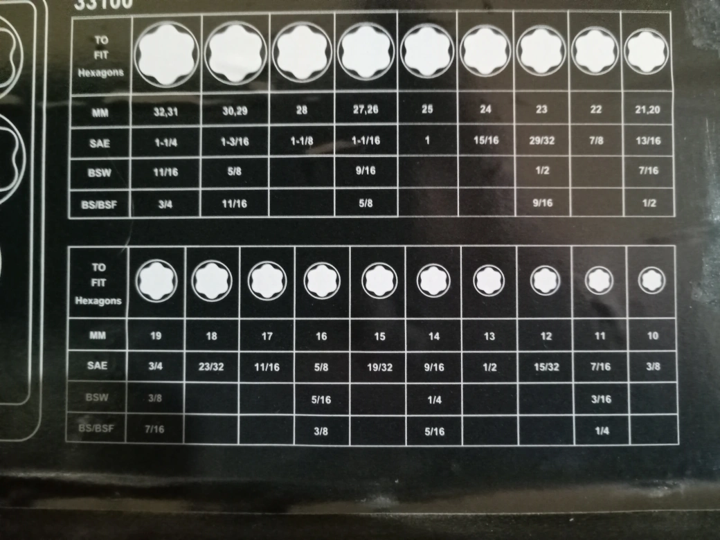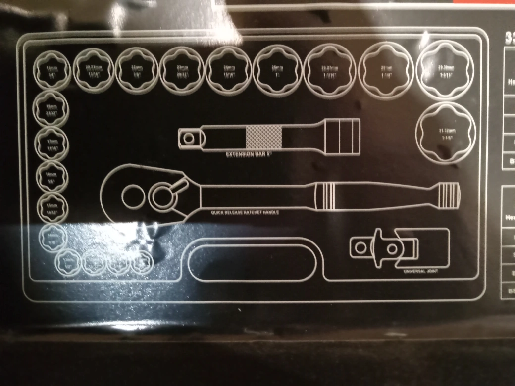 Socket set with a variety of sizes. Comes with a ratchet, extension bar, and universal joint. Each socket does both imperial and metric sizes. From 3/8&10mm to 1-1/4&31/32mm.