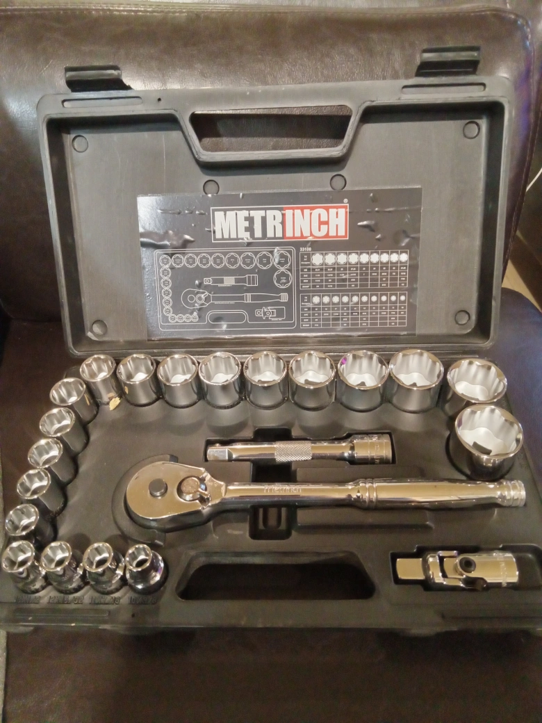 Socket set with a variety of sizes. Comes with a ratchet, extension bar, and universal joint. Each socket does both imperial and metric sizes. From 3/8&10mm to 1-1/4&31/32mm.