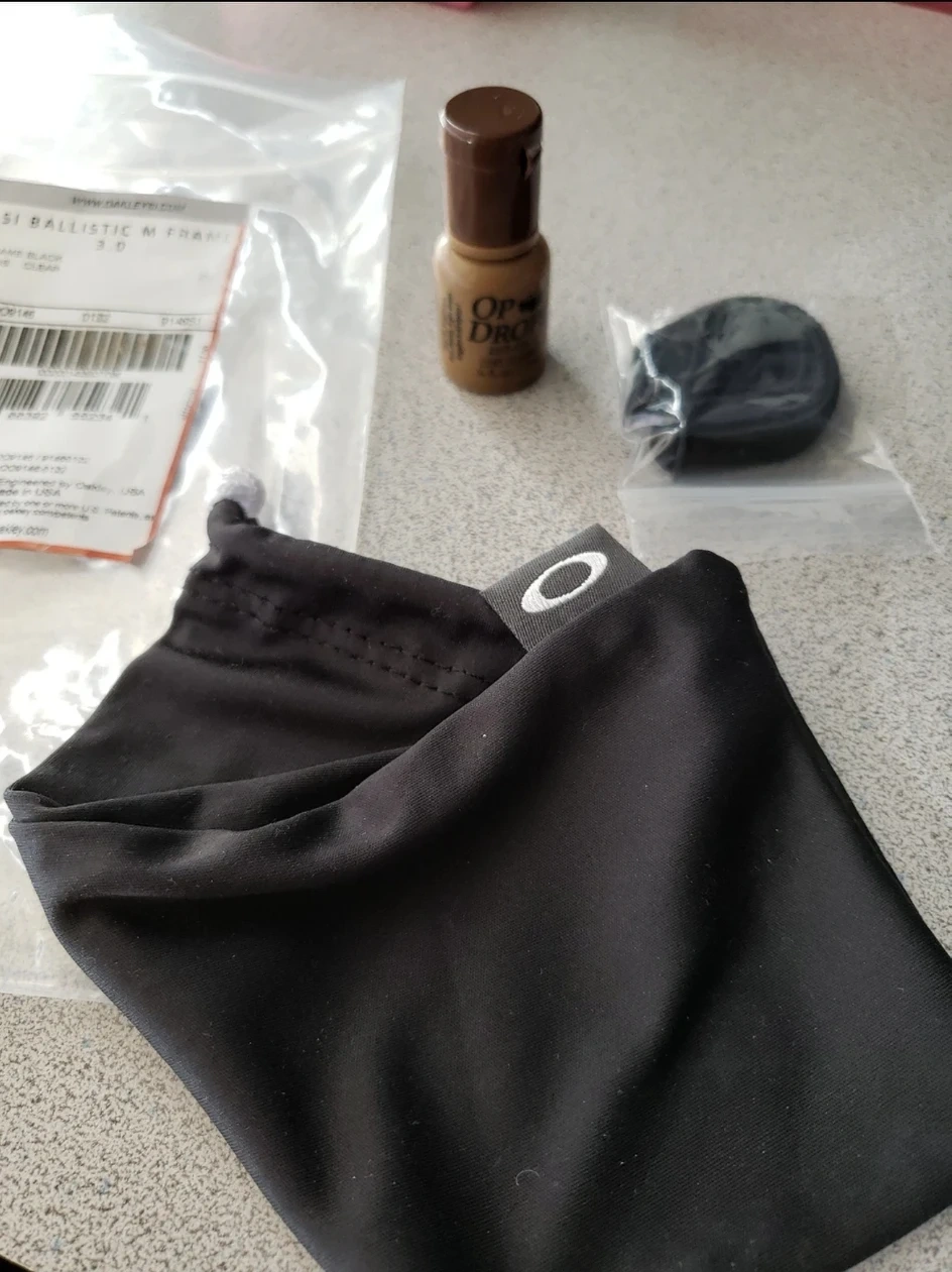 Brand new. Plastic. Comes with eyeglass bag/cloth, anti-fog/lens cleaner (7.5 ml), eyeglass string holder.