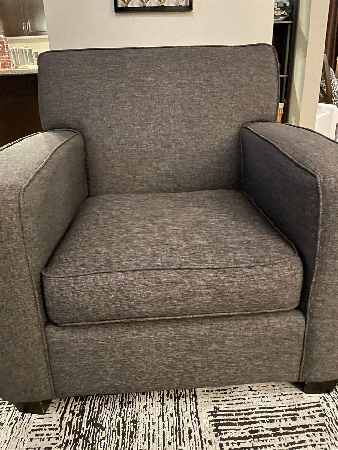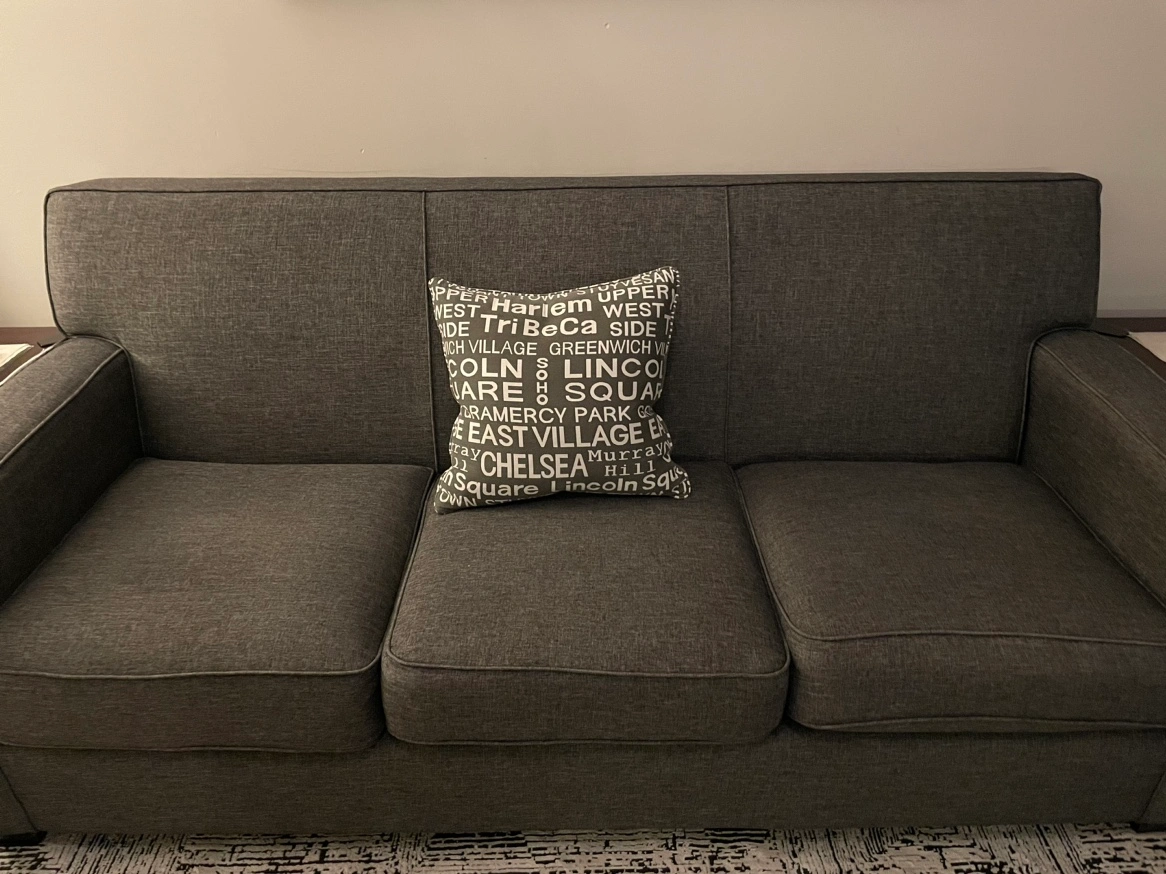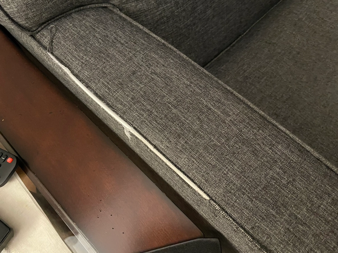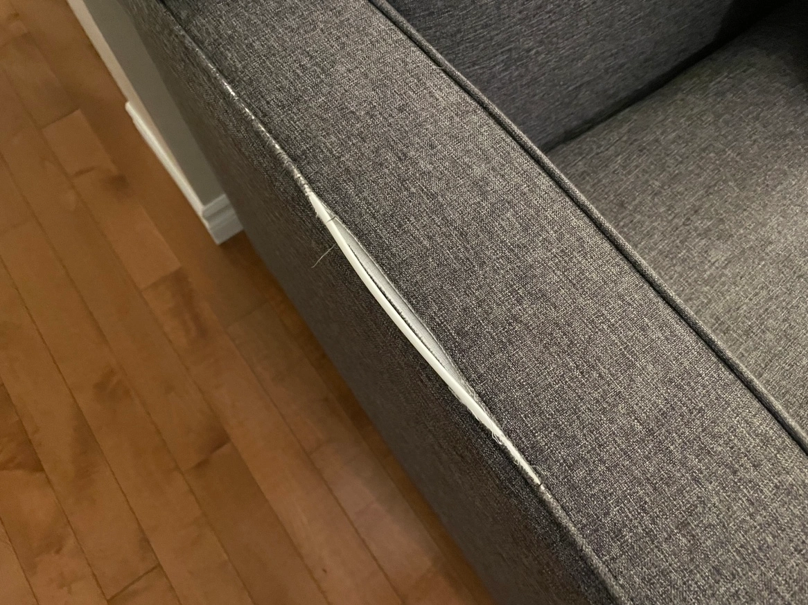 Three piece sofa set bought from Leon’s 5 years back. The seats and back are very comfortable. Some of the fabric has cosmetic rip ( as shown in the pictures). Comes with two cushions