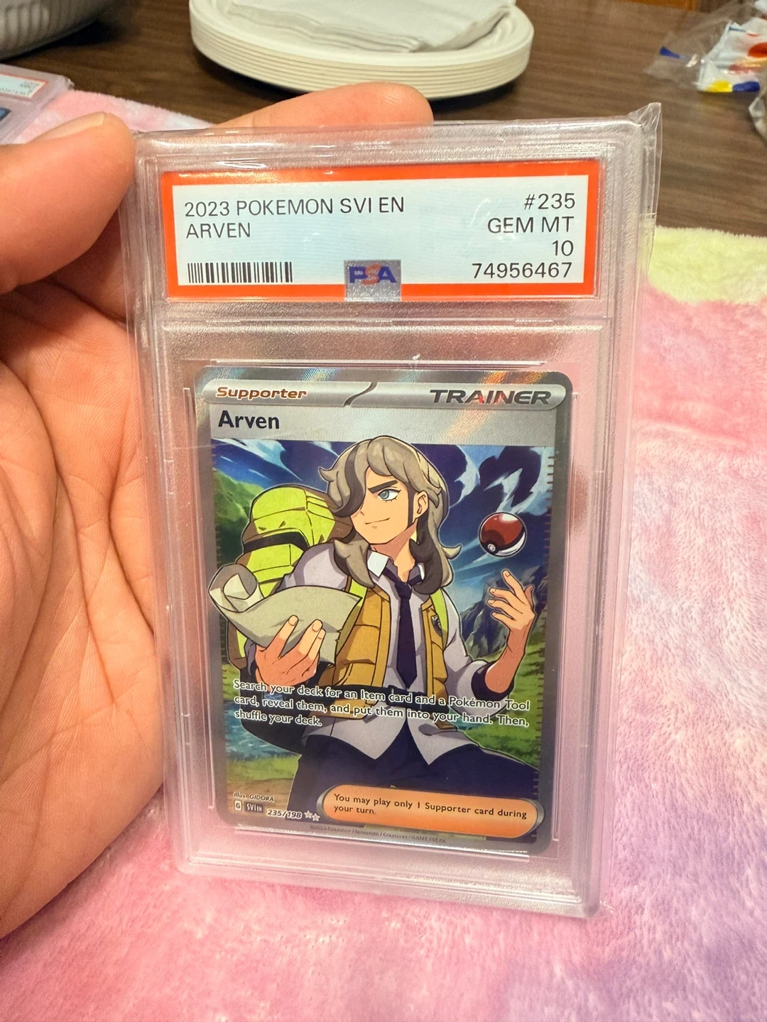 Includes a graded King Vegeta, Invasion's Command card from Dragon Ball Super and a graded Arven Trainer card from the 2023 Pokemon SVi EN set. Both cards are professionally graded. The Dragon Ball card is from the Sayen Showdown set.