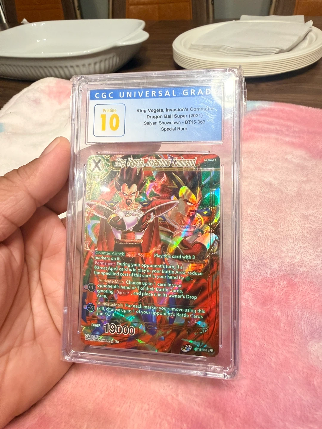 Includes a graded King Vegeta, Invasion's Command card from Dragon Ball Super and a graded Arven Trainer card from the 2023 Pokemon SVi EN set. Both cards are professionally graded. The Dragon Ball card is from the Sayen Showdown set.