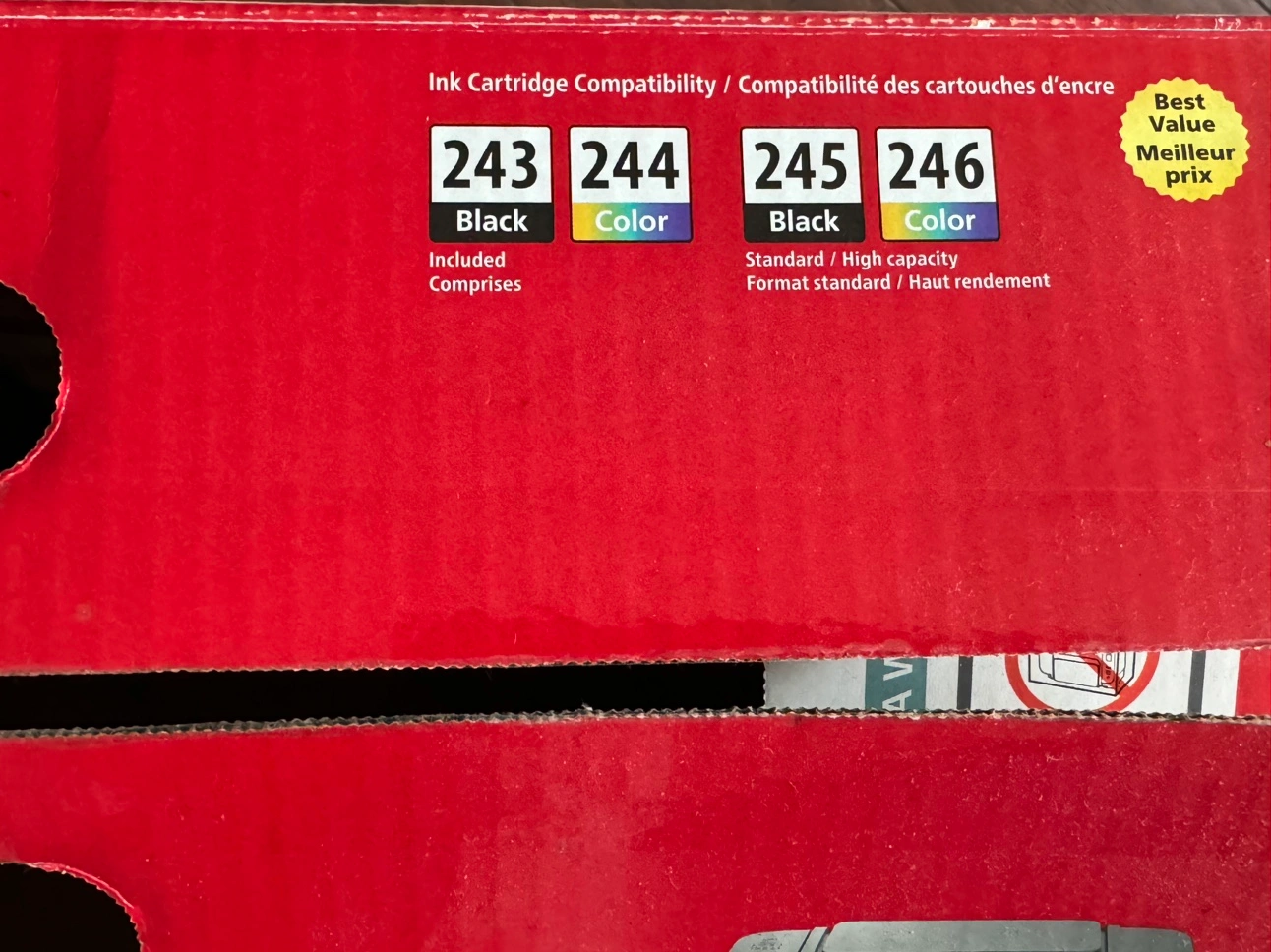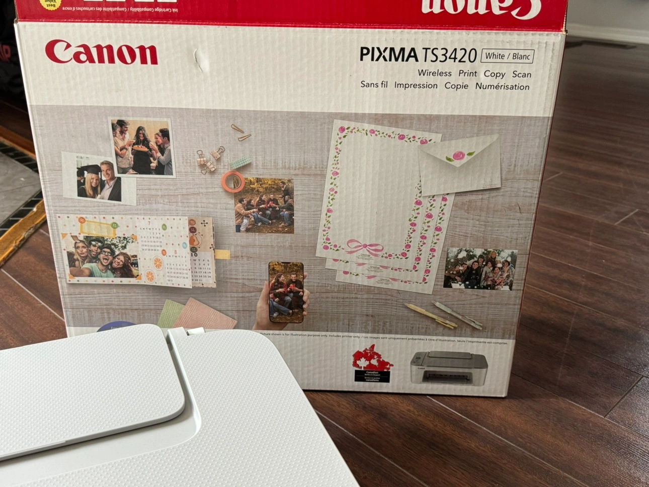 Canon PIXMA TS3420 Wireless Printer. The printer is white and has a flatbed scanner. The printer comes with the original box and instructions. It uses Canon 243, 244, 245, and 246 ink cartridges.