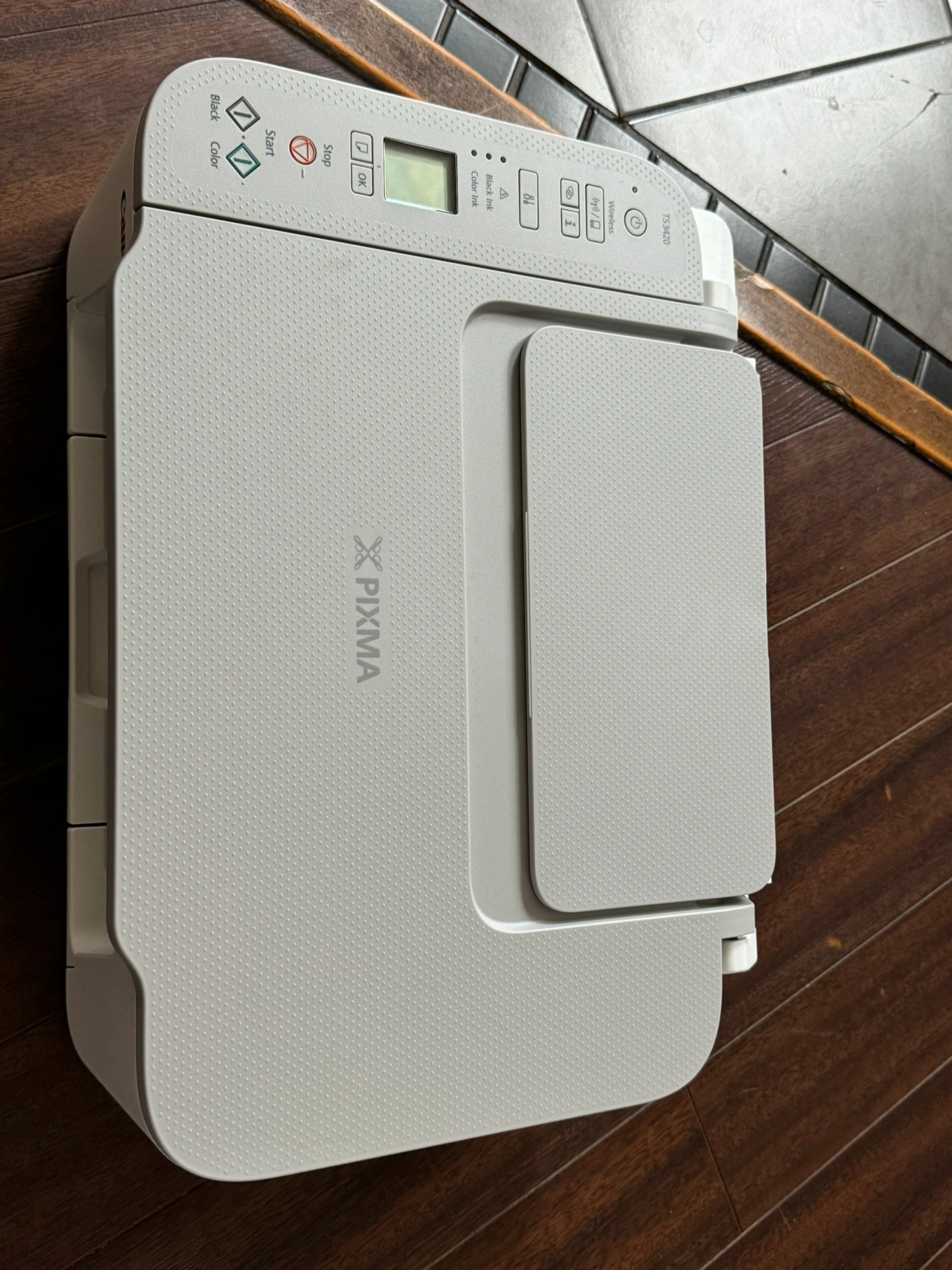 Canon PIXMA TS3420 Wireless Printer. The printer is white and has a flatbed scanner. The printer comes with the original box and instructions. It uses Canon 243, 244, 245, and 246 ink cartridges.
