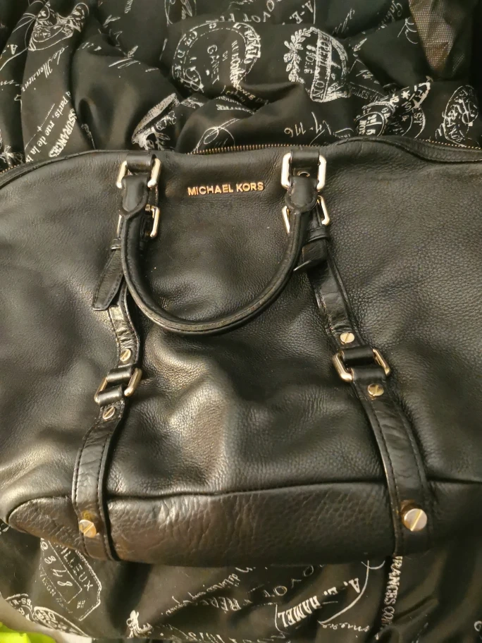 Black leather handbag with gold accents. It has a shoulder strap and a top handle. It has multiple compartments for easy organization. A stylish and functional handbag.