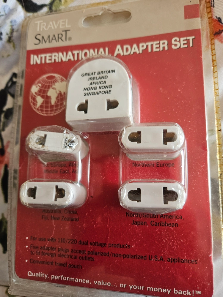 A set of five international travel adapters. Each adapter is designed to fit a different type of electrical outlet. The set comes with a convenient travel pouch.