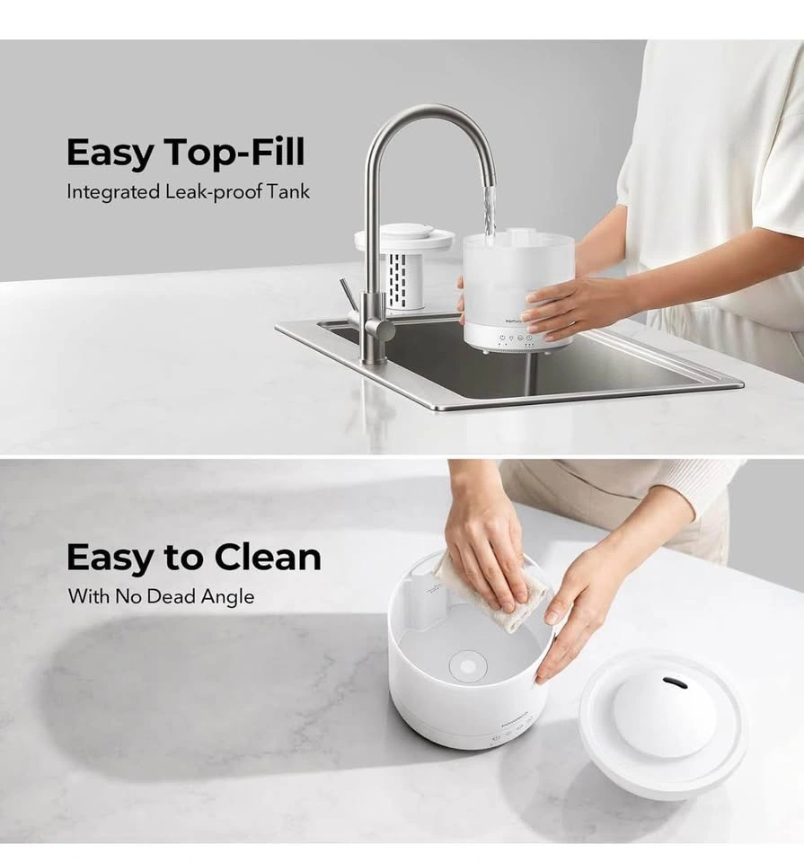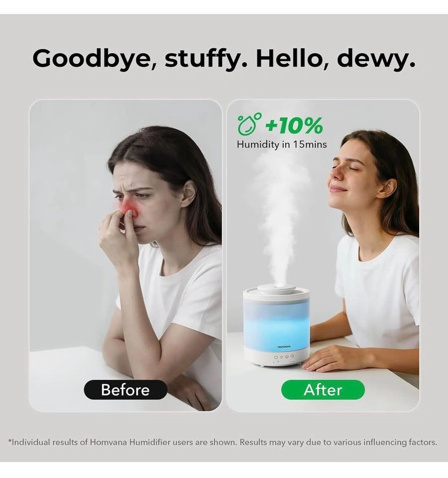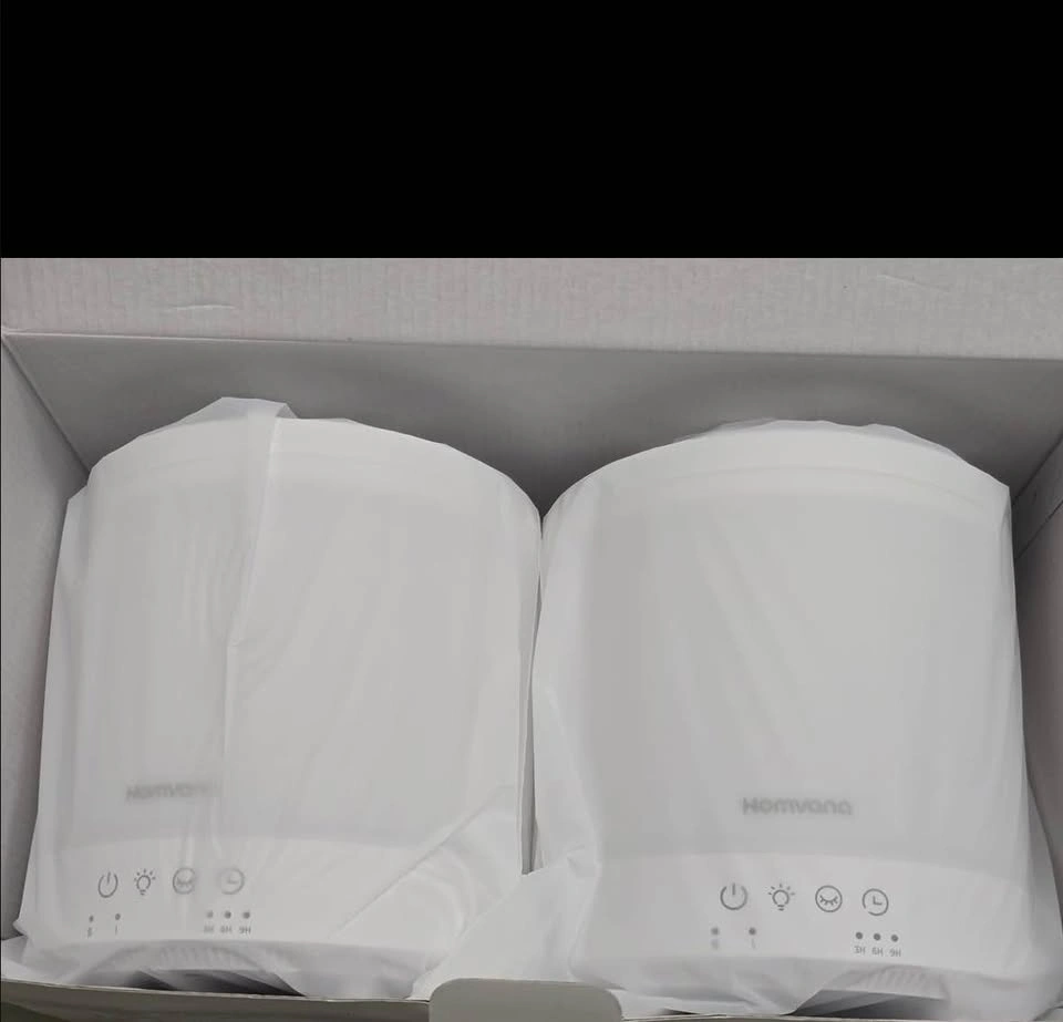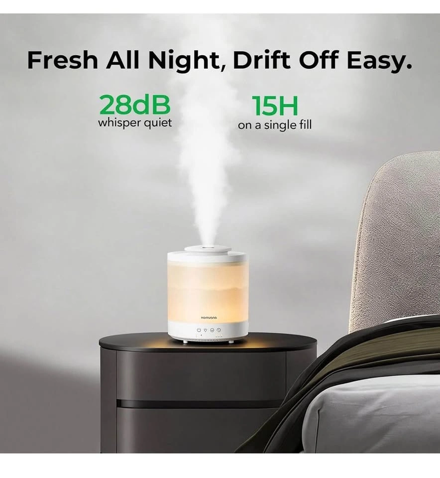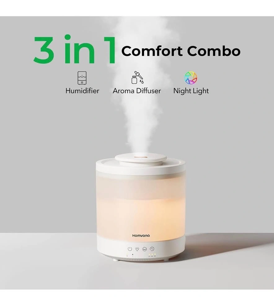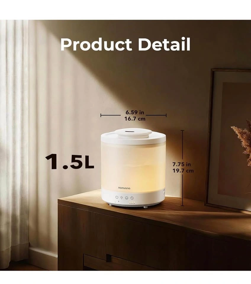 Versatile Homvana 1.5L humidifier with 3-in-1 functions: humidifier, aroma diffuser, and night light. Includes a timer for 3, 6, or 9 hours. Measures about 6.59 inches wide and 7.75 inches tall.