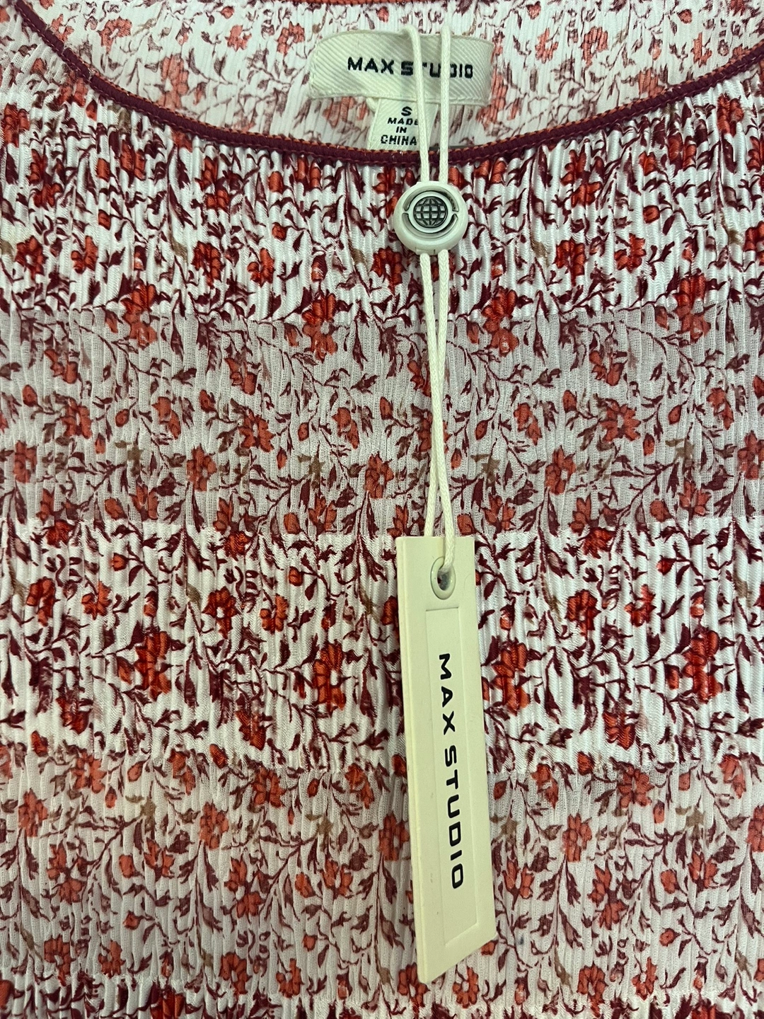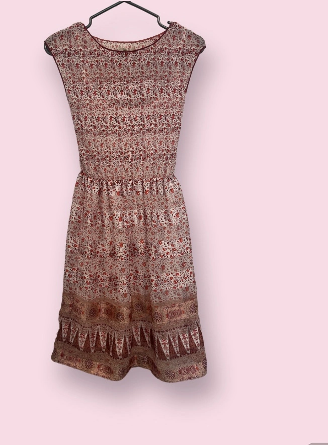 A lovely floral dress with a fitted bodice and a flowy skirt. The dress has a round neckline and short sleeves. It is made of a lightweight fabric and is perfect for warm weather.