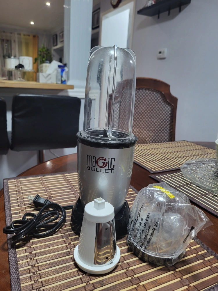 Magic Bullet Blender with extra parts. Includes the original parts plus an extra cup, base, and blade. Comes with power cord. No box. Never used at all.. the condition looks like it is used coz i hide it in the cabinet for too long without its box.