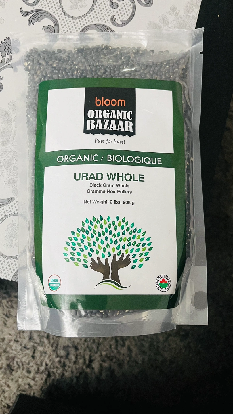 Organic whole black gram from Bloom Organic Bazaar. Net weight: 2 lbs, 908 g.